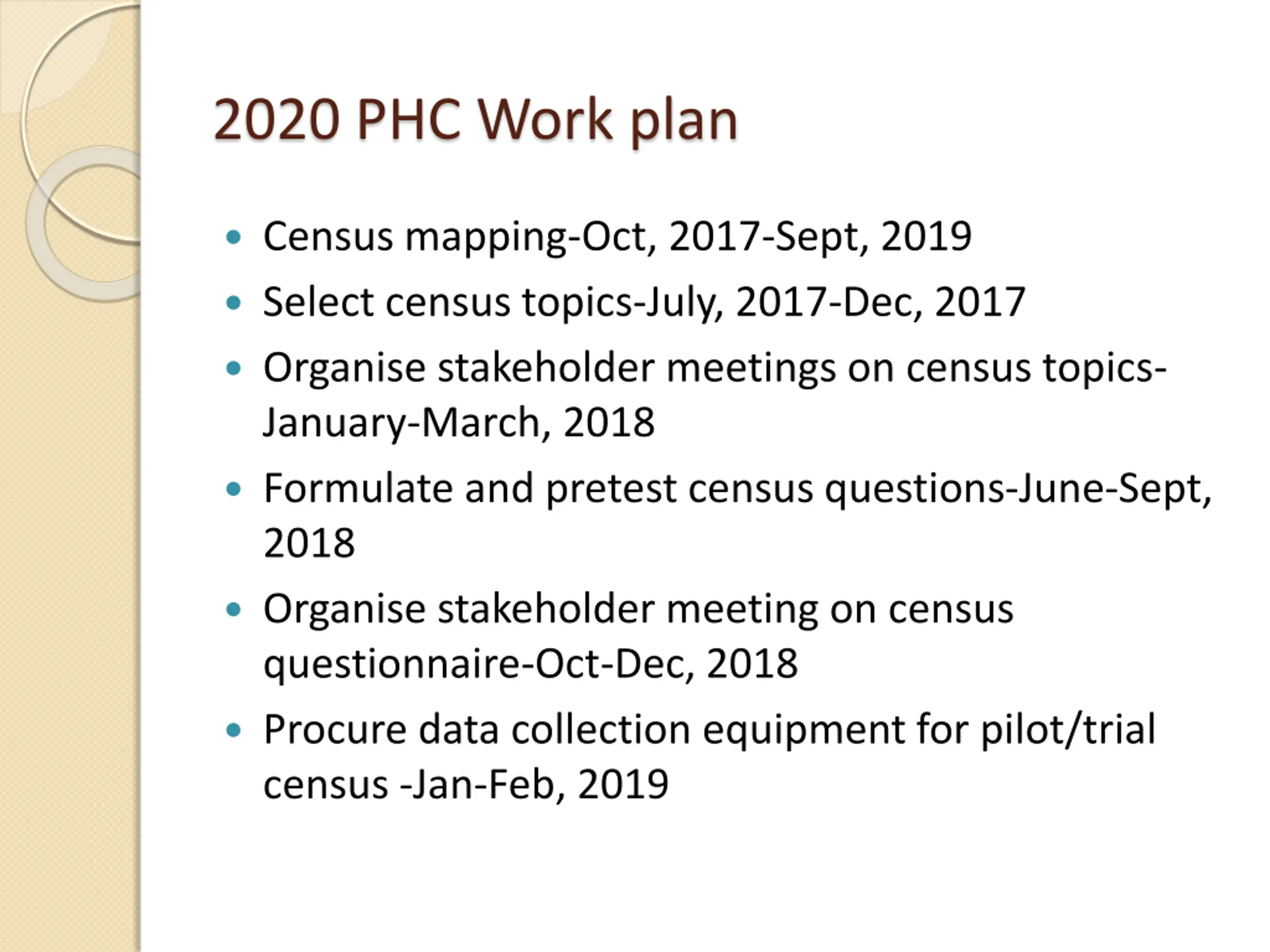 2020 PHC Work plan Census mapping-Oct, 2017-Sept, 2019 Select census topics-July, 2017-Dec, 2017 Organise stakeholder meetings on census topics- January-March, 2018 Formulate and pretest census questions-June-Sept, 2018 Organise stakeholder meeting on census questionnaire-Oct-Dec, 2018 Procure data collection equipment for pilot/trial census -Jan-Feb, 2019