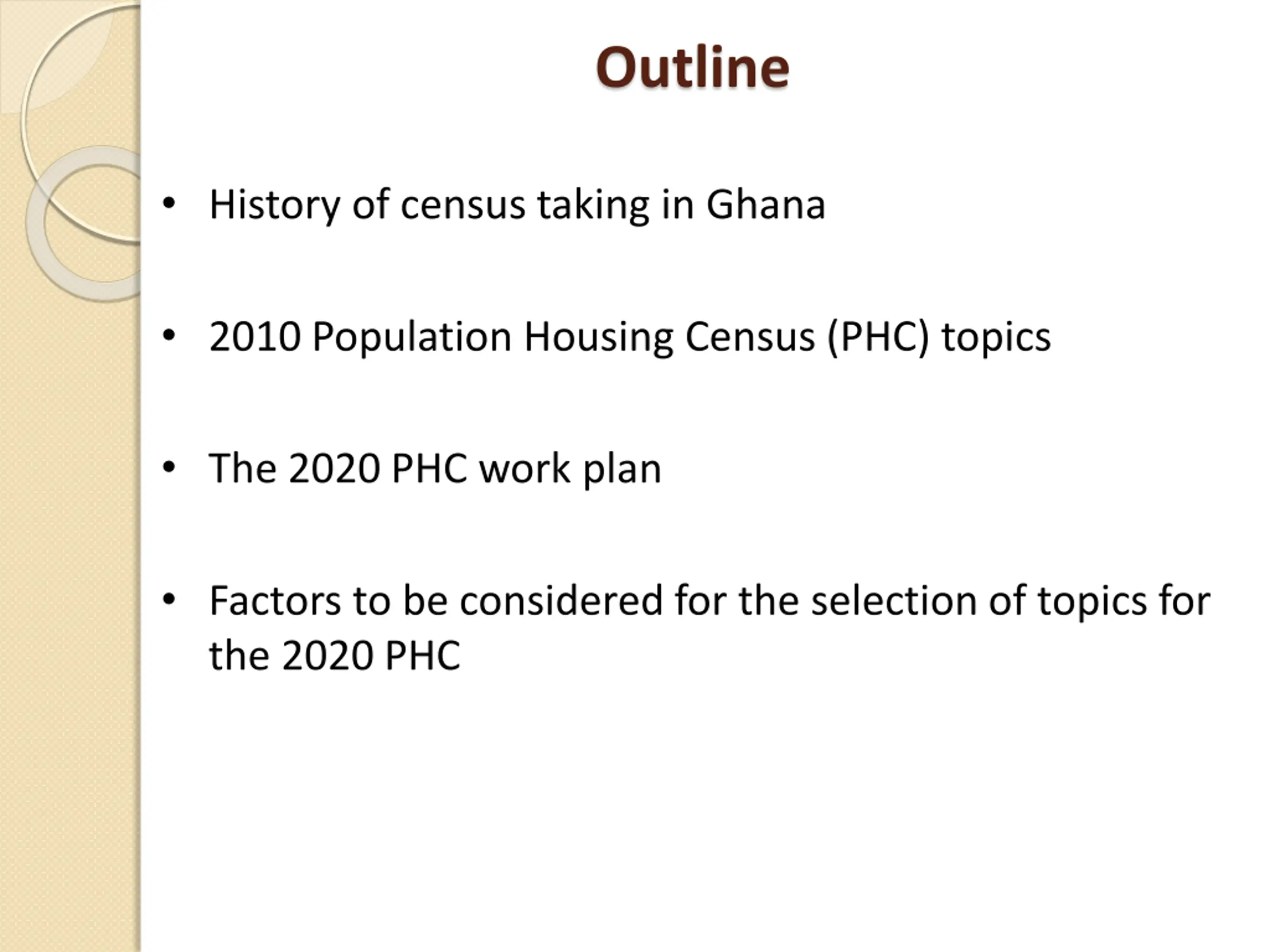 Outline History of census taking in Ghana 2010 Population Housing Census (PHC) topics The 2020 PHC work plan Factors to be considered for the selection of topics for the 2020 PHC