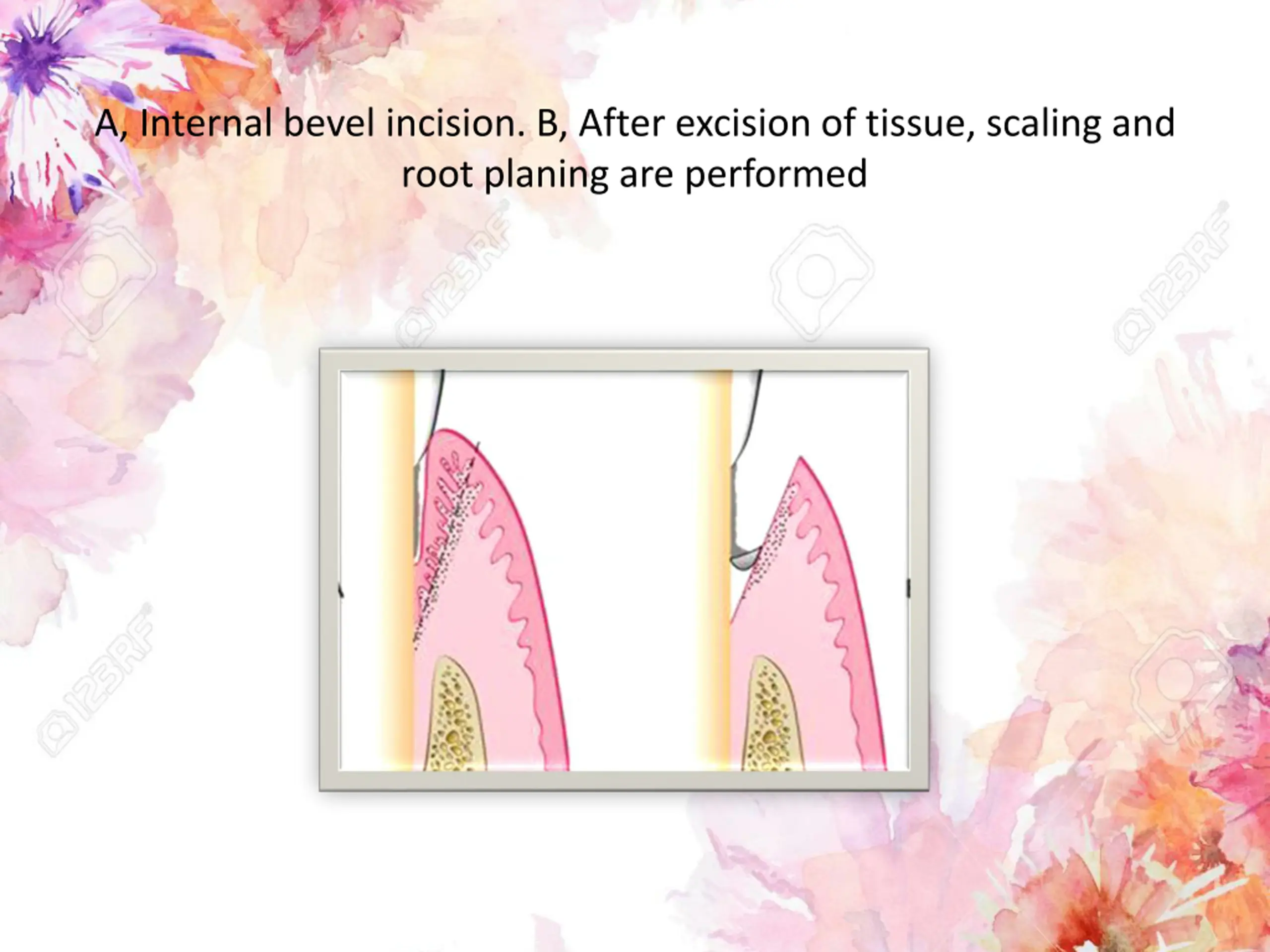 After adequate anesthesia, make an internal bevel incision Remove the excised tissue with a curette, carefully perform root planing on all exposed cementum