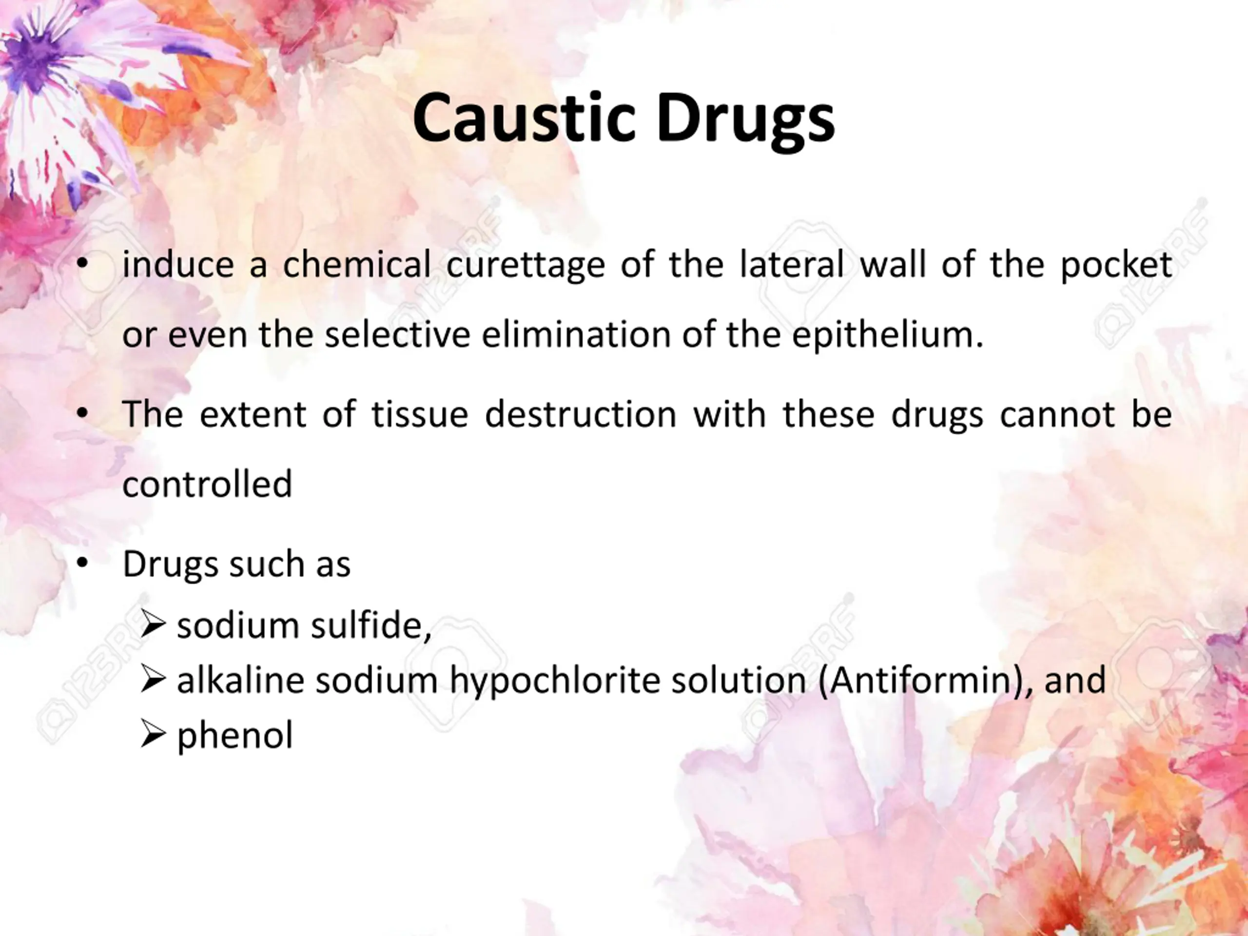 Caustic Drugs induce a chemical curettage of the lateral wall of the pocket or even the selective elimination of the epithelium. The extent of tissue destruction with these drugs cannot be controlled Drugs such as sodium sulfide, alkaline sodium hypochlorite solution (Antiformin), and phenol