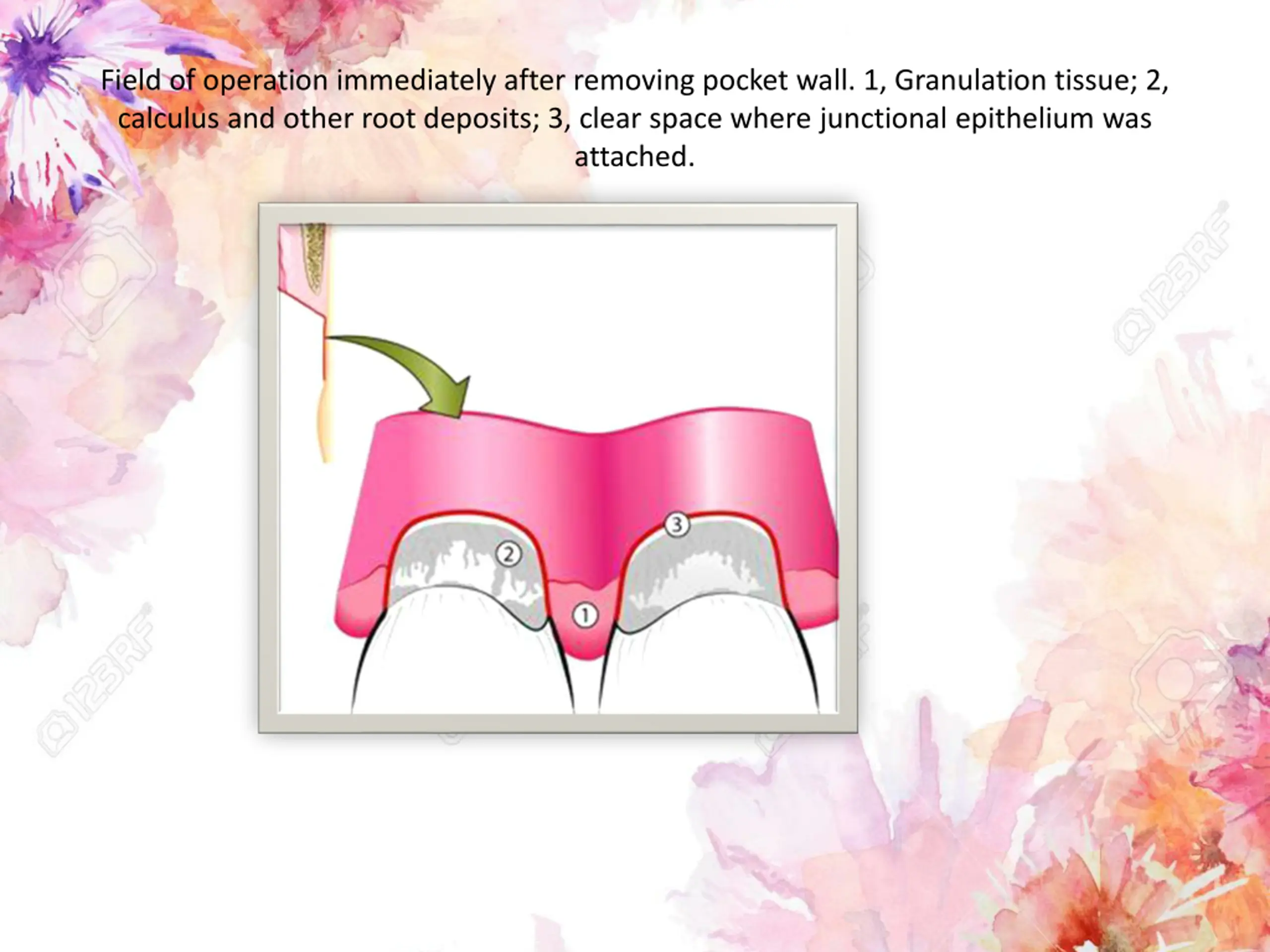 Field of operation immediately after removing pocket wall. 1, Granulation tissue; 2, calculus and other root deposits; 3, clear space where junctional epithelium was attached.
