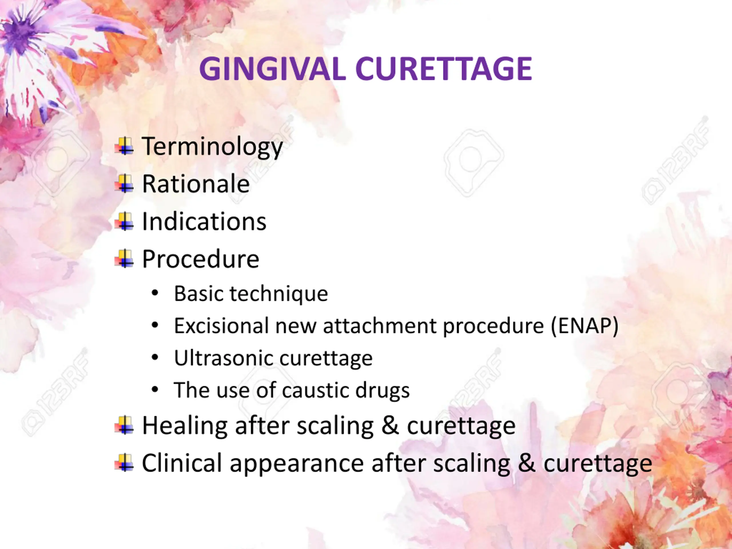GINGIVAL CURETTAGE Terminology Rationale Indications Procedure Basic technique Excisional new attachment procedure (ENAP) Ultrasonic curettage The use of caustic drugs Healing after scaling & curettage Clinical appearance after scaling & curettage