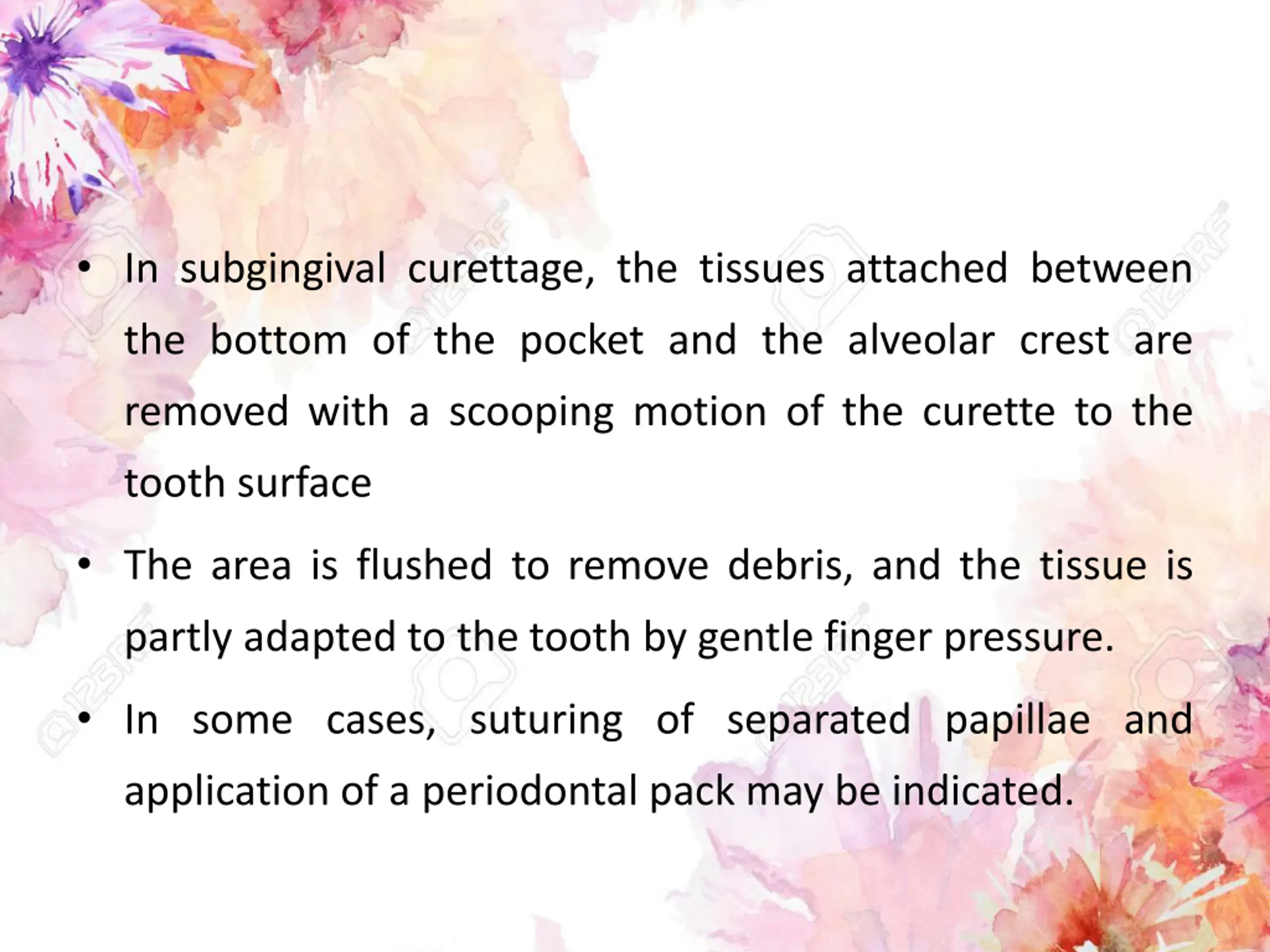 In subgingival curettage, the tissues attached between the bottom of the pocket and the alveolar crest are removed with a scooping motion of the curette to the tooth surface The area is flushed to remove debris, and the tissue is partly adapted to the tooth by gentle finger pressure. In some cases, suturing of separated papillae and application of a periodontal pack may be indicated.