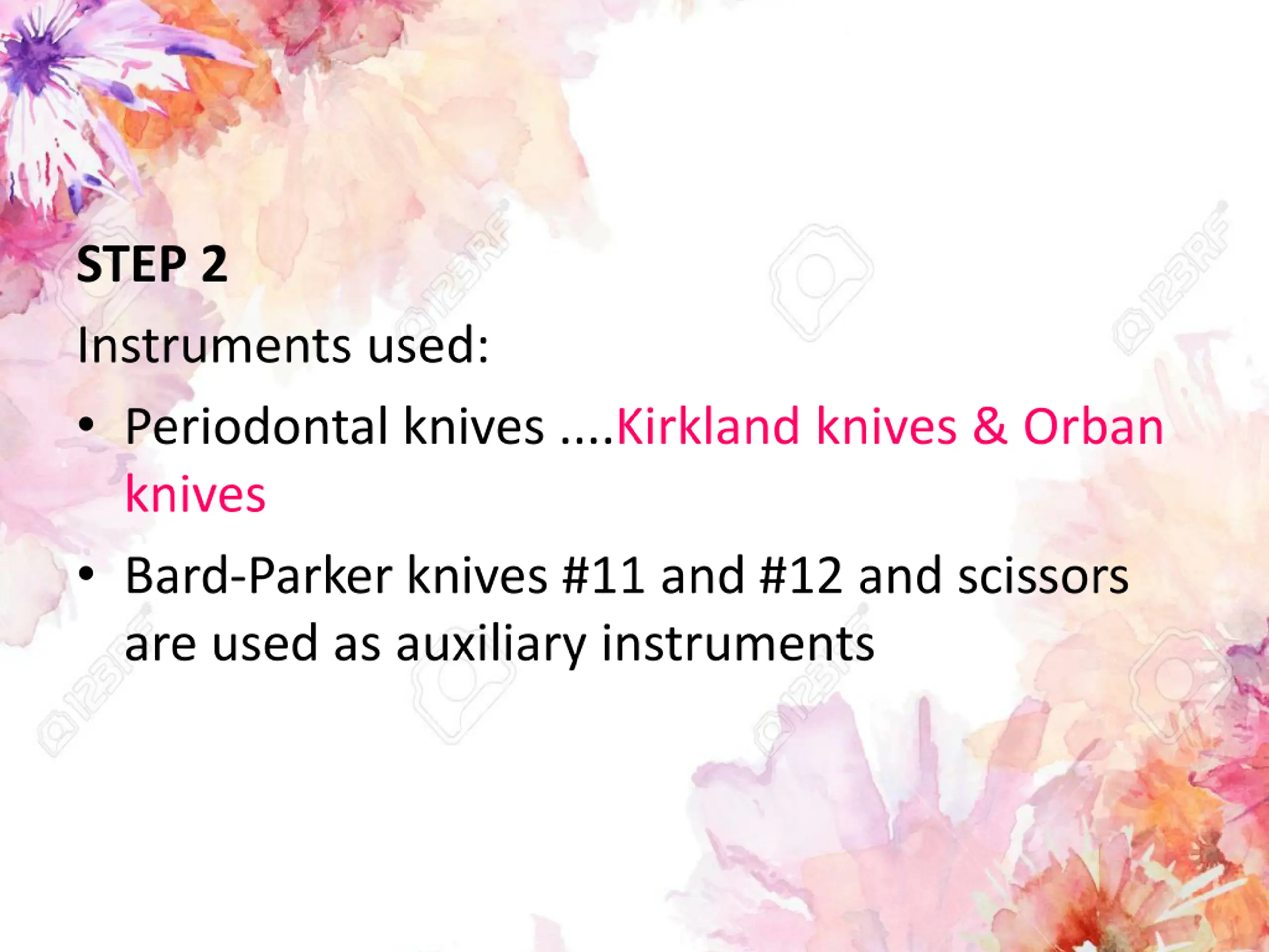 STEP 2 Instruments used: Periodontal knives ....Kirkland knives & Orban knives Bard-Parker knives #11 and #12 and scissors are used as auxiliary instruments