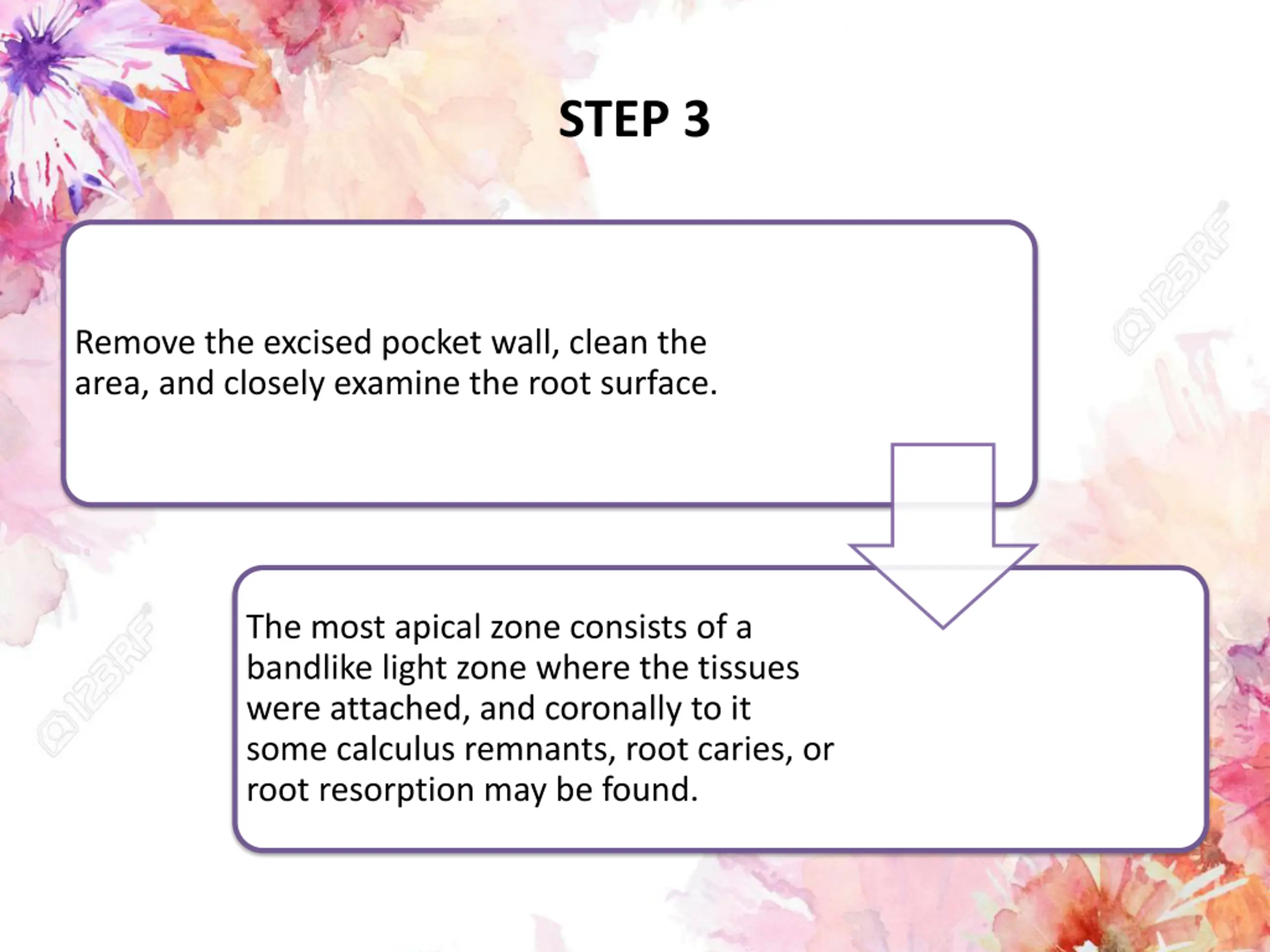 STEP 3 Remove the excised pocket wall, clean the area, and closely examine the root surface. The most apical zone consists of a bandlike light zone where the tissues were attached, and coronally to it some calculus remnants, root caries, or root resorption may be found.