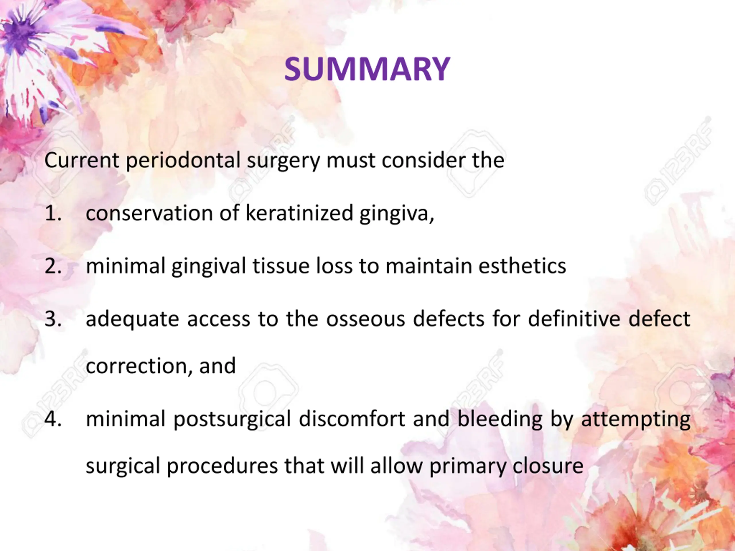 SUMMARY Current periodontal surgery must consider the 1. conservation of keratinized gingiva, 2. minimal gingival tissue loss to maintain esthetics 3. adequate access to the osseous defects for definitive defect correction, and 4. minimal postsurgical discomfort and bleeding by attempting surgical procedures that will allow primary closure