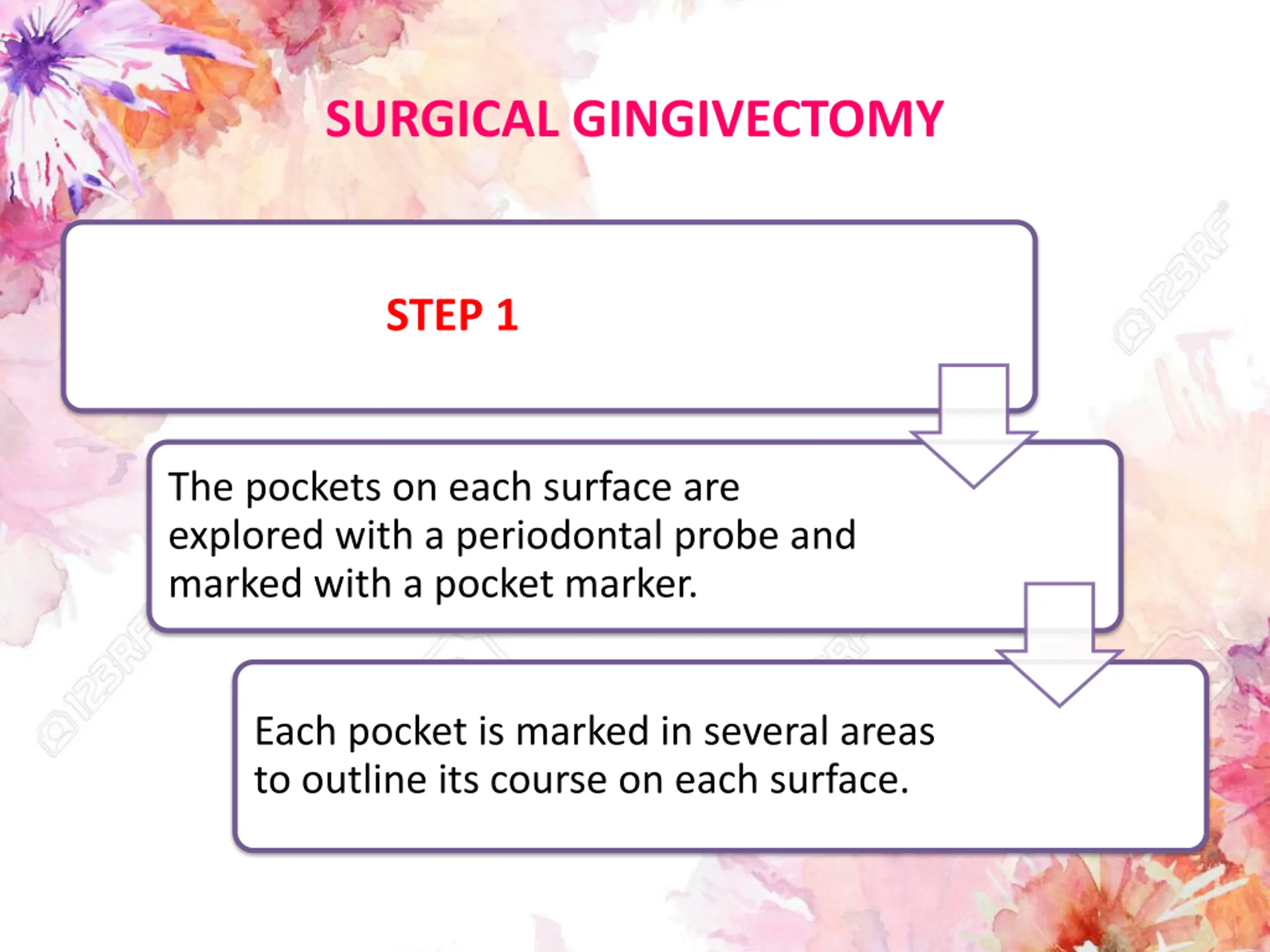 SURGICAL GINGIVECTOMY STEP 1 The pockets on each surface are explored with a periodontal probe and marked with a pocket marker. Each pocket is marked in several areas to outline its course on each surface.