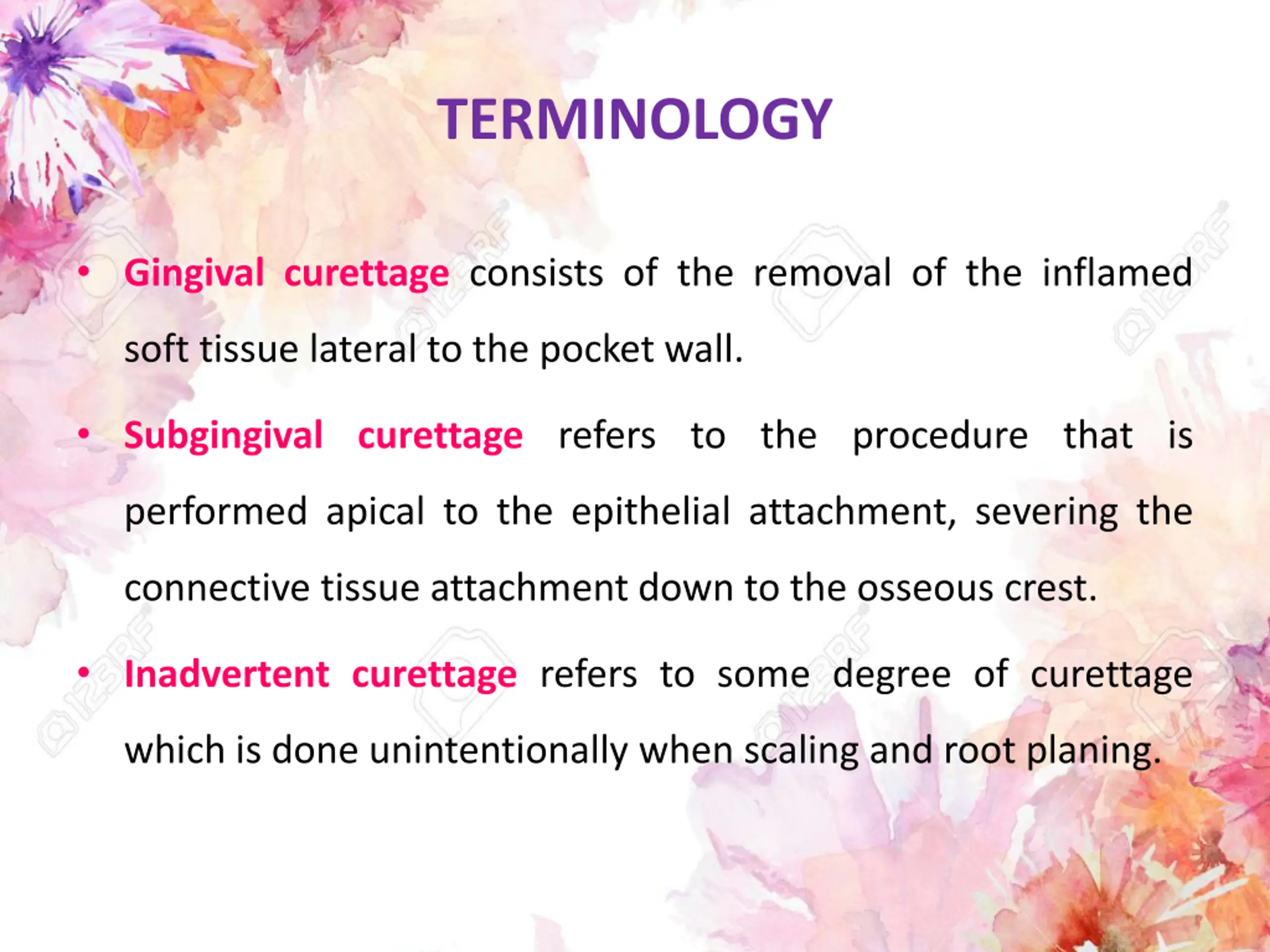 TERMINOLOGY Gingival curettage consists of the removal of the inflamed soft tissue lateral to the pocket wall. Subgingival curettage refers to the procedure that is performed apical to the epithelial attachment, severing the connective tissue attachment down to the osseous crest. Inadvertent curettage refers to some degree of curettage which is done unintentionally when scaling and root planing.