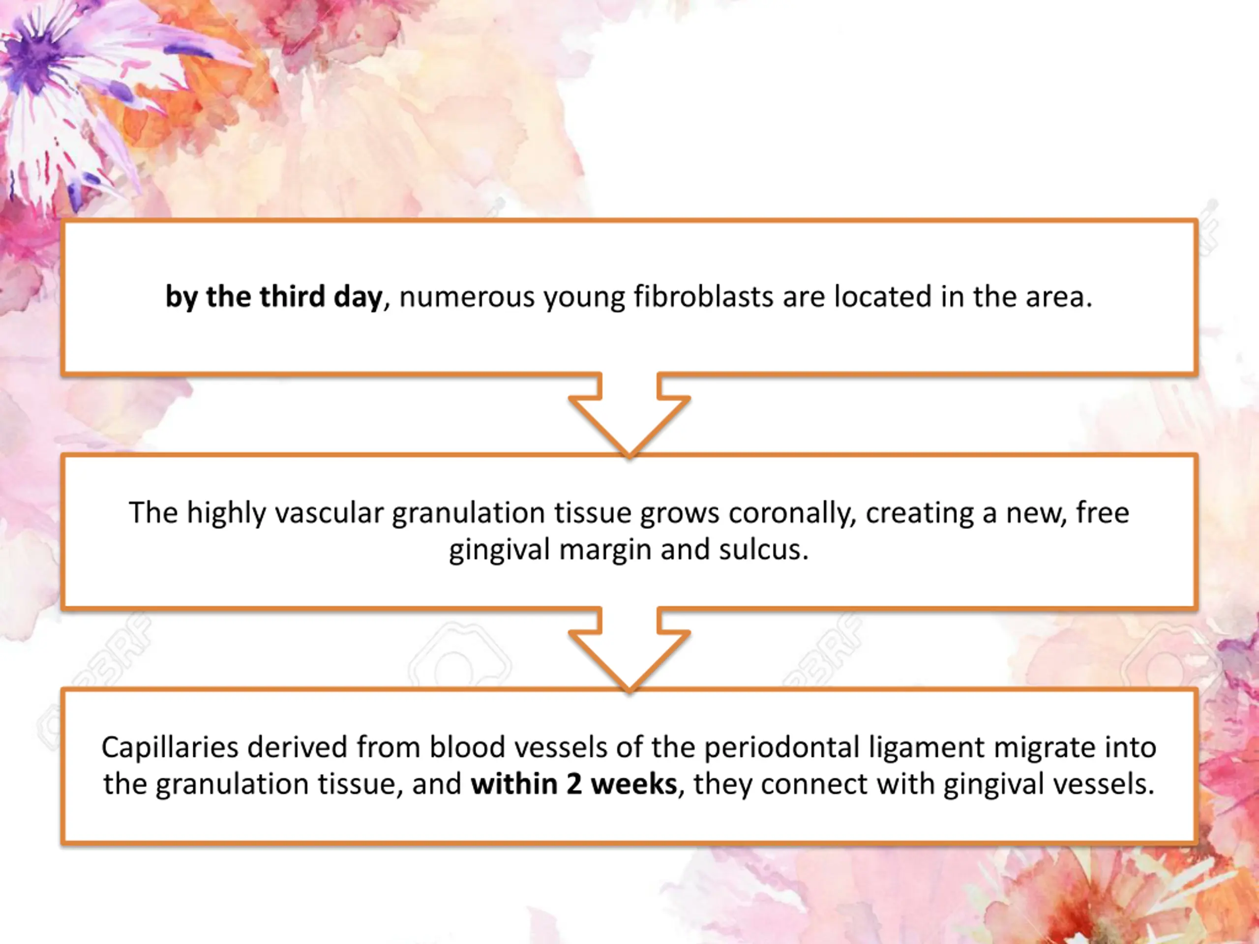 by the third day, numerous young fibroblasts are located in the area. The highly vascular granulation tissue grows coronally, creating a new, free gingival margin and sulcus. Capillaries derived from blood vessels of the periodontal ligament migrate into the granulation tissue, and within 2 weeks, they connect with gingival vessels.