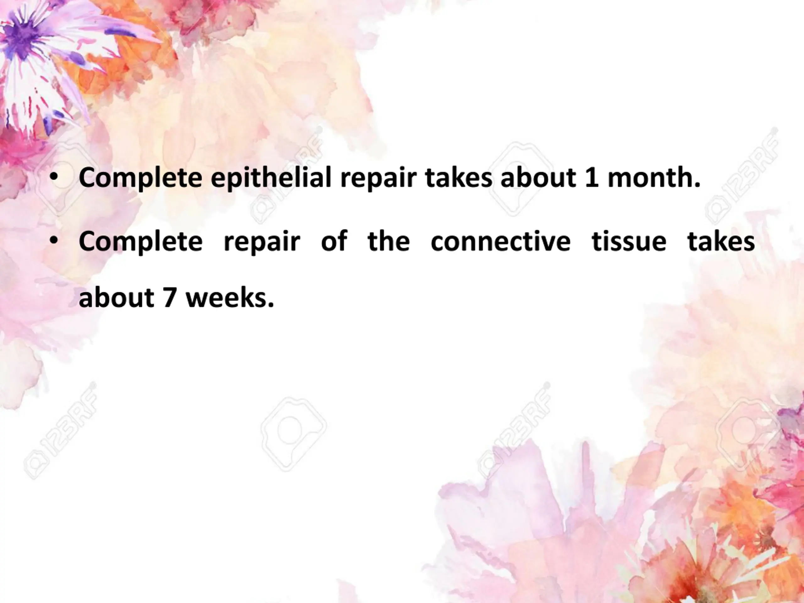 Complete epithelial repair takes about 1 month. Complete repair of the connective tissue takes about 7 weeks.