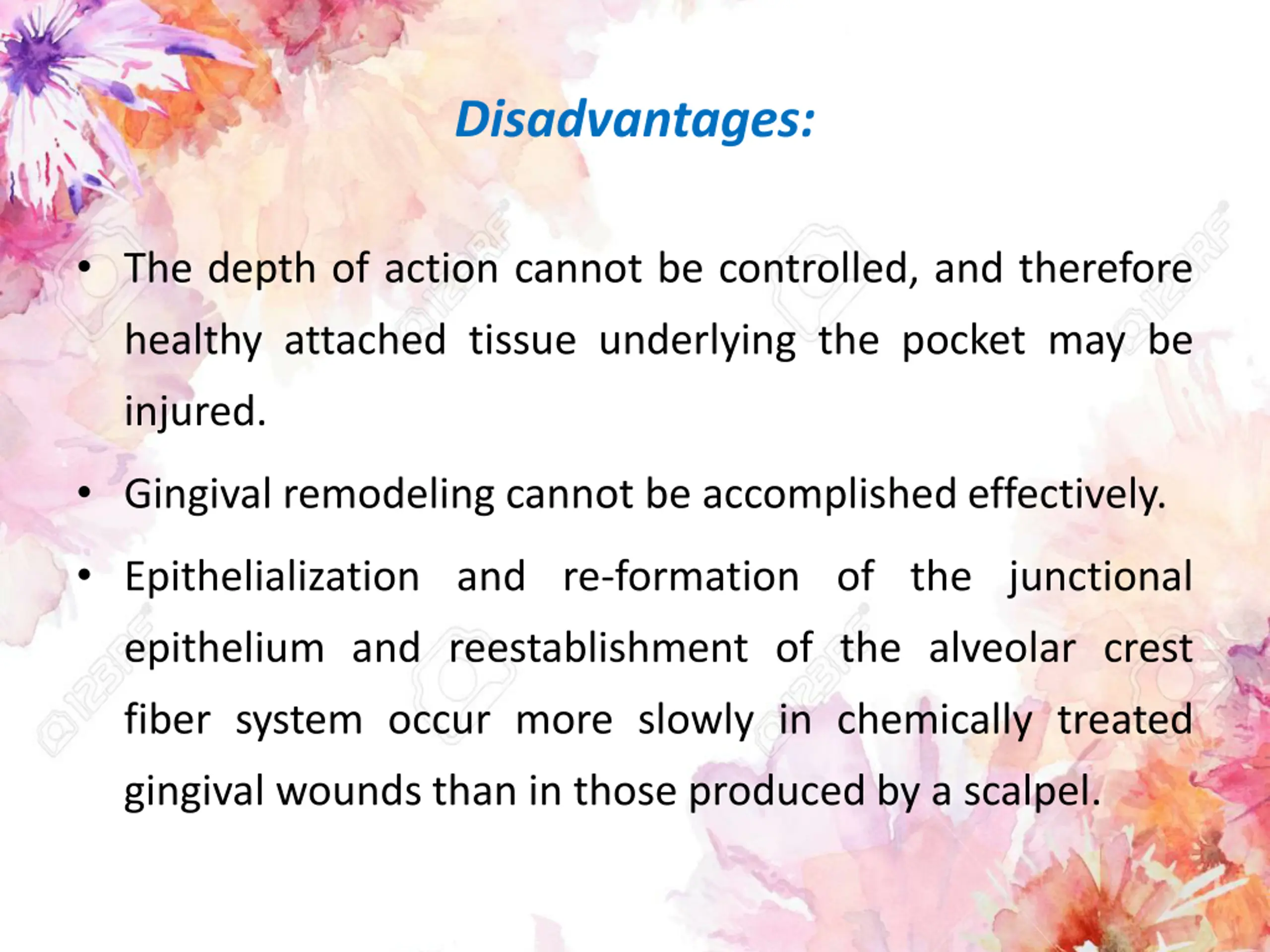 Disadvantages: The depth of action cannot be controlled, and therefore healthy attached tissue underlying the pocket may be injured. Gingival remodeling cannot be accomplished effectively. Epithelialization and re-formation of the junctional epithelium and reestablishment of the alveolar crest fiber system occur more slowly in chemically treated gingival wounds than in those produced by a scalpel.