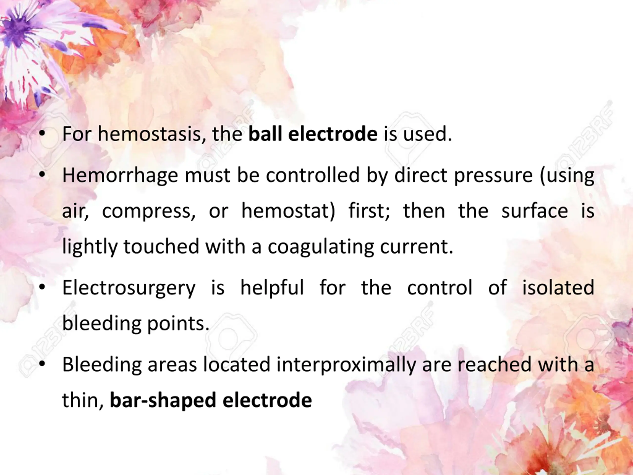 For hemostasis, the ball electrode is used. Hemorrhage must be controlled by direct pressure (using air, compress, or hemostat) first; then the surface is lightly touched with a coagulating current. Electrosurgery is helpful for the control of isolated bleeding points. Bleeding areas located interproximally are reached with a thin, bar-shaped electrode