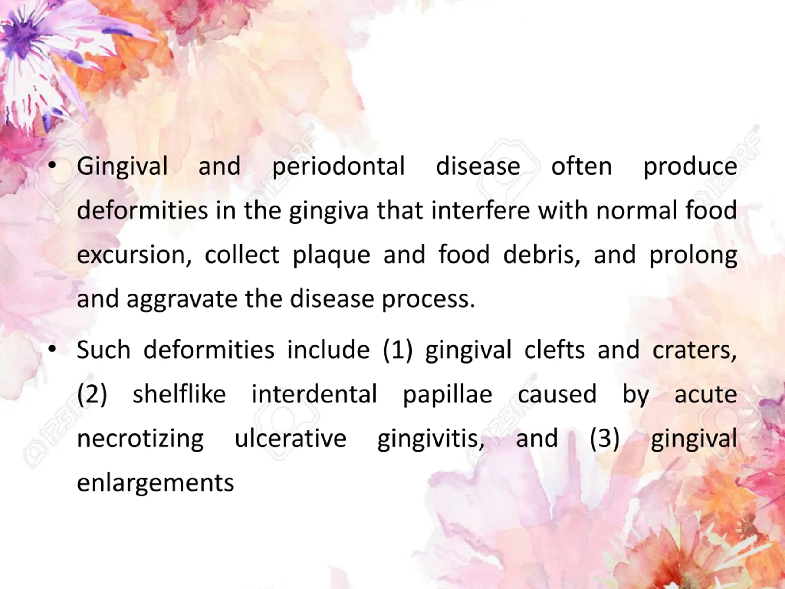 Gingival and periodontal disease often produce deformities in the gingiva that interfere with normal food excursion, collect plaque and food debris, and prolong and aggravate the disease process. Such deformities include (1) gingival clefts and craters, (2) shelflike interdental papillae caused by acute necrotizing ulcerative gingivitis, and (3) gingival enlargements
