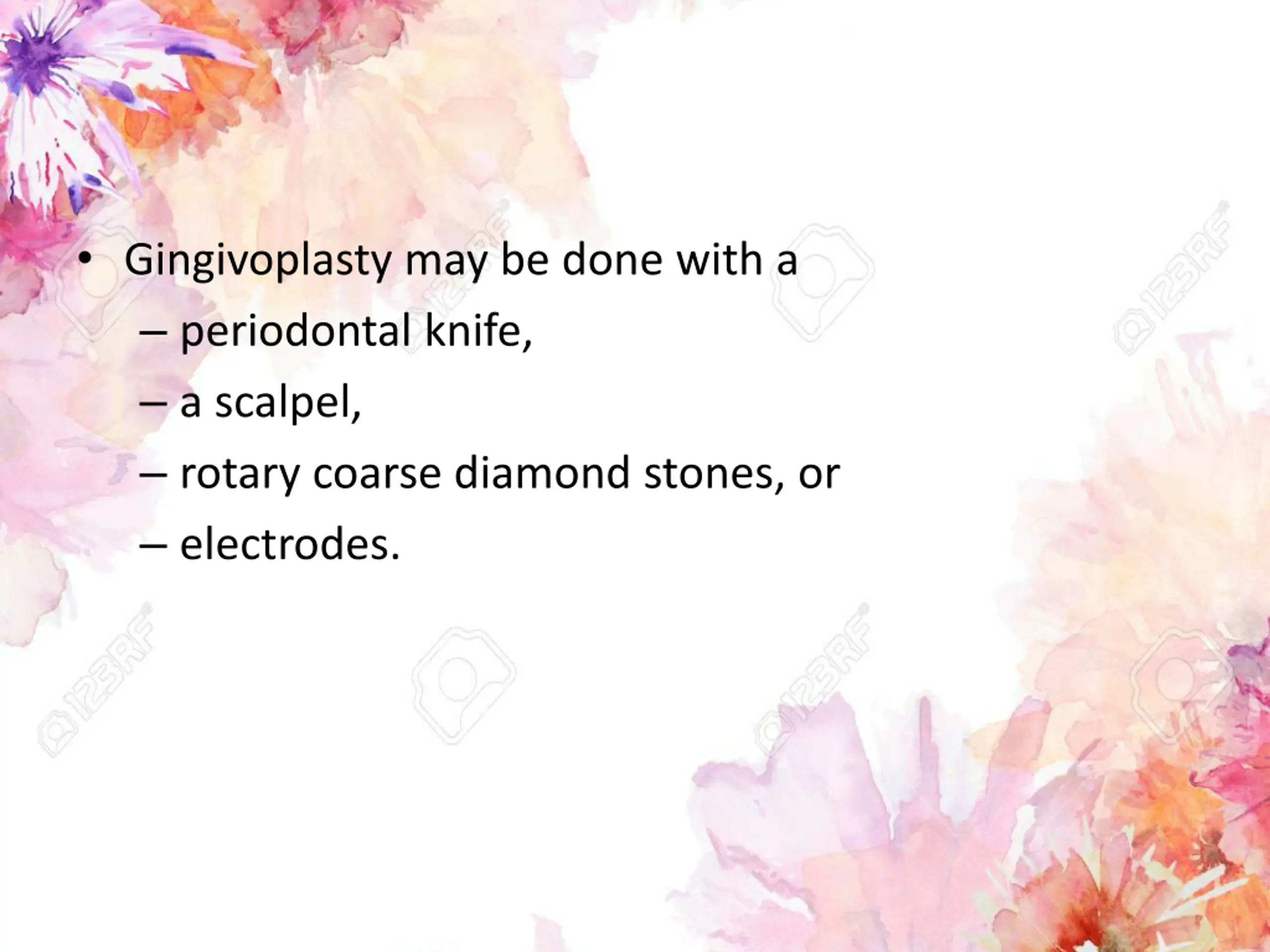 Gingivoplasty may be done with a periodontal knife, a scalpel, rotary coarse diamond stones, or electrodes.