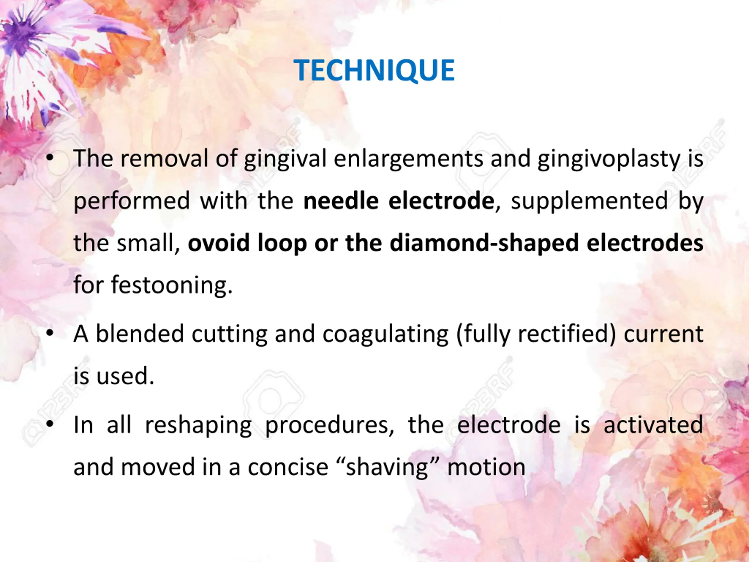 TECHNIQUE The removal of gingival enlargements and gingivoplasty is performed with the needle electrode, supplemented by the small, ovoid loop or the diamond-shaped electrodes for festooning. A blended cutting and coagulating (fully rectified) current is used. In all reshaping procedures, the electrode is activated and moved in a concise shaving motion
