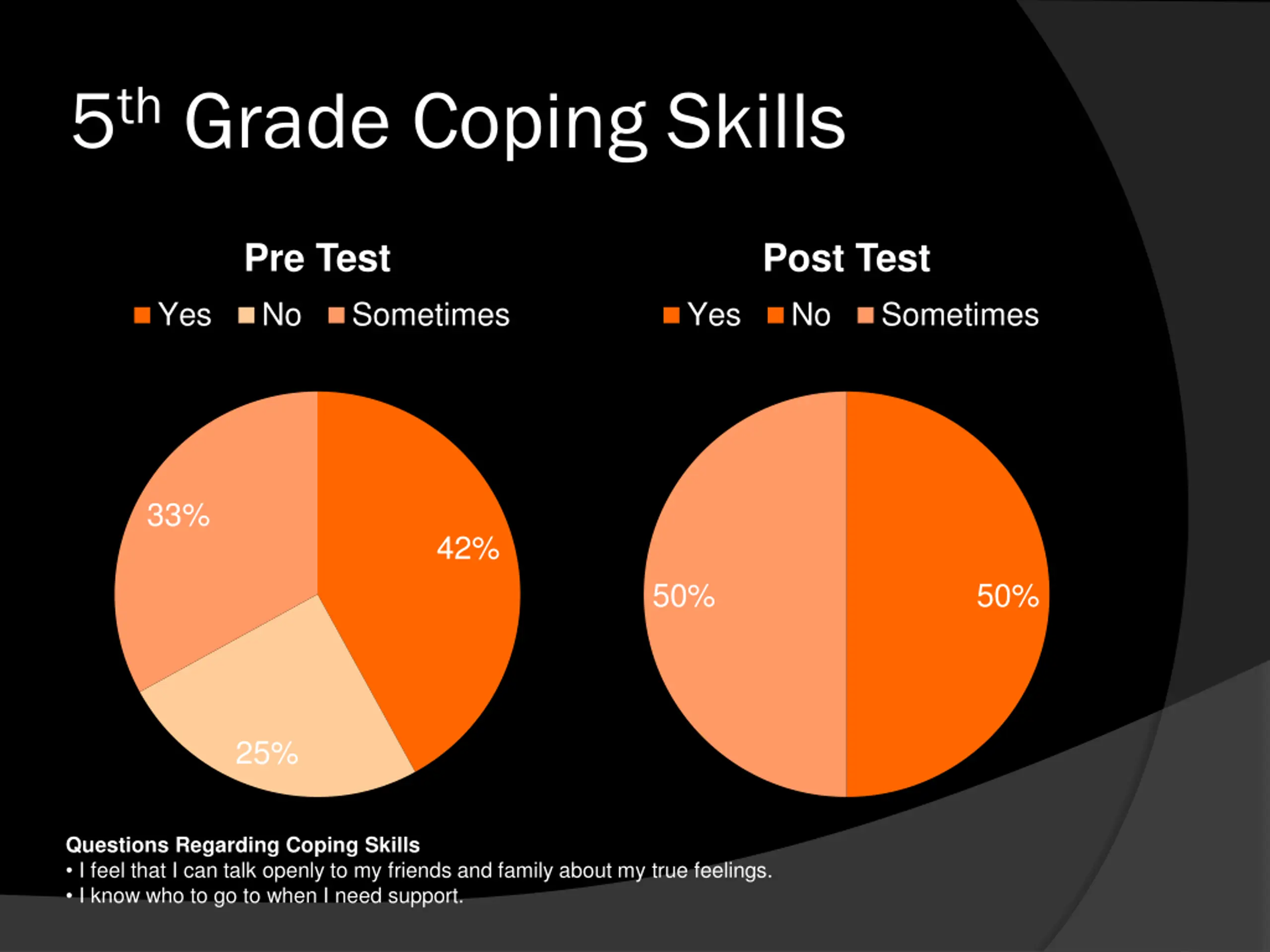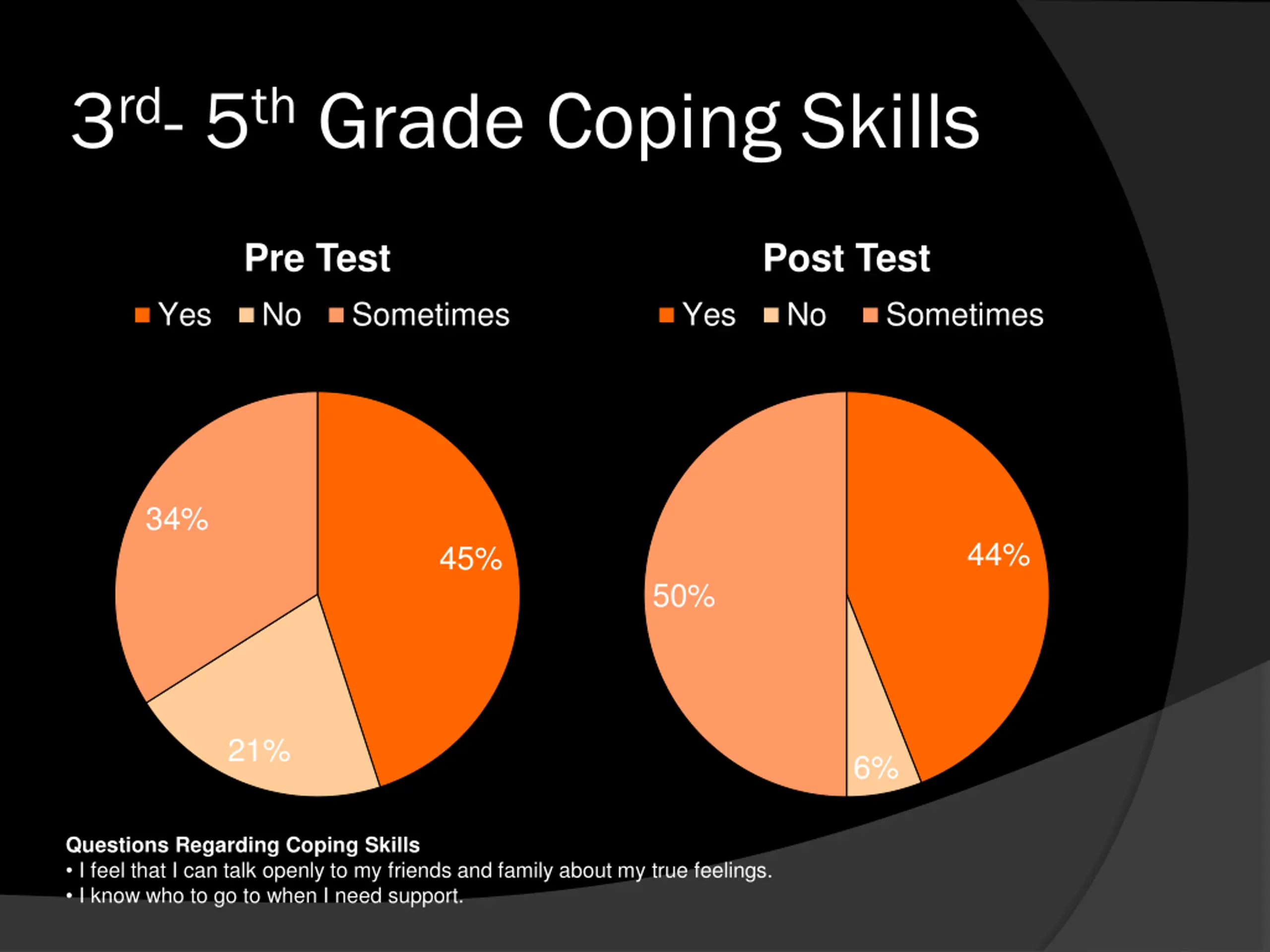 3rd- 5th Grade Coping Skills Pre Test No Post Test No Yes Sometimes Yes Sometimes 34% 44% 45% 50% 21% 6% Questions Regarding Coping Skills I feel that I can talk openly to my friends and family about my true feelings. I know who to go to when I need support.