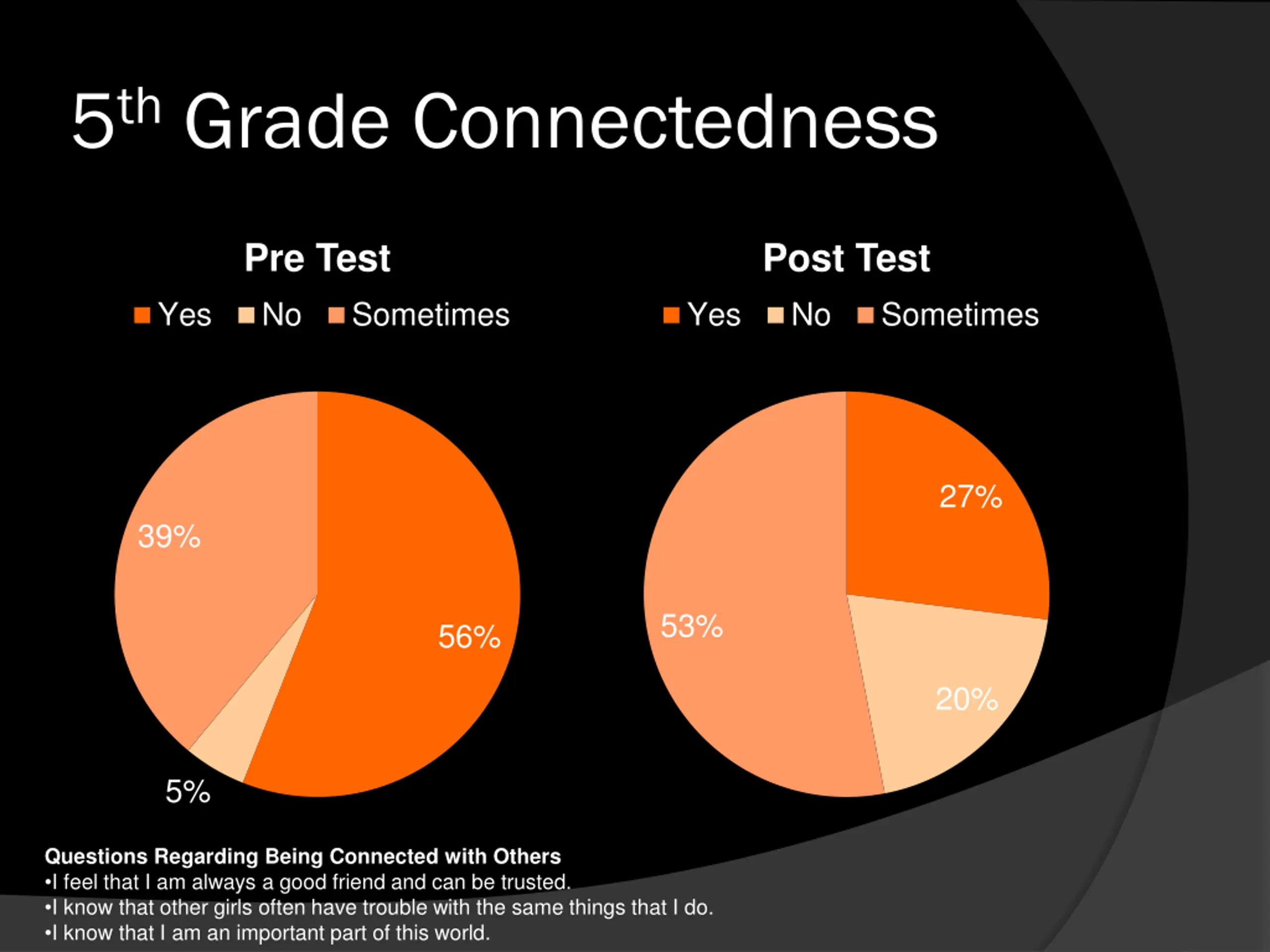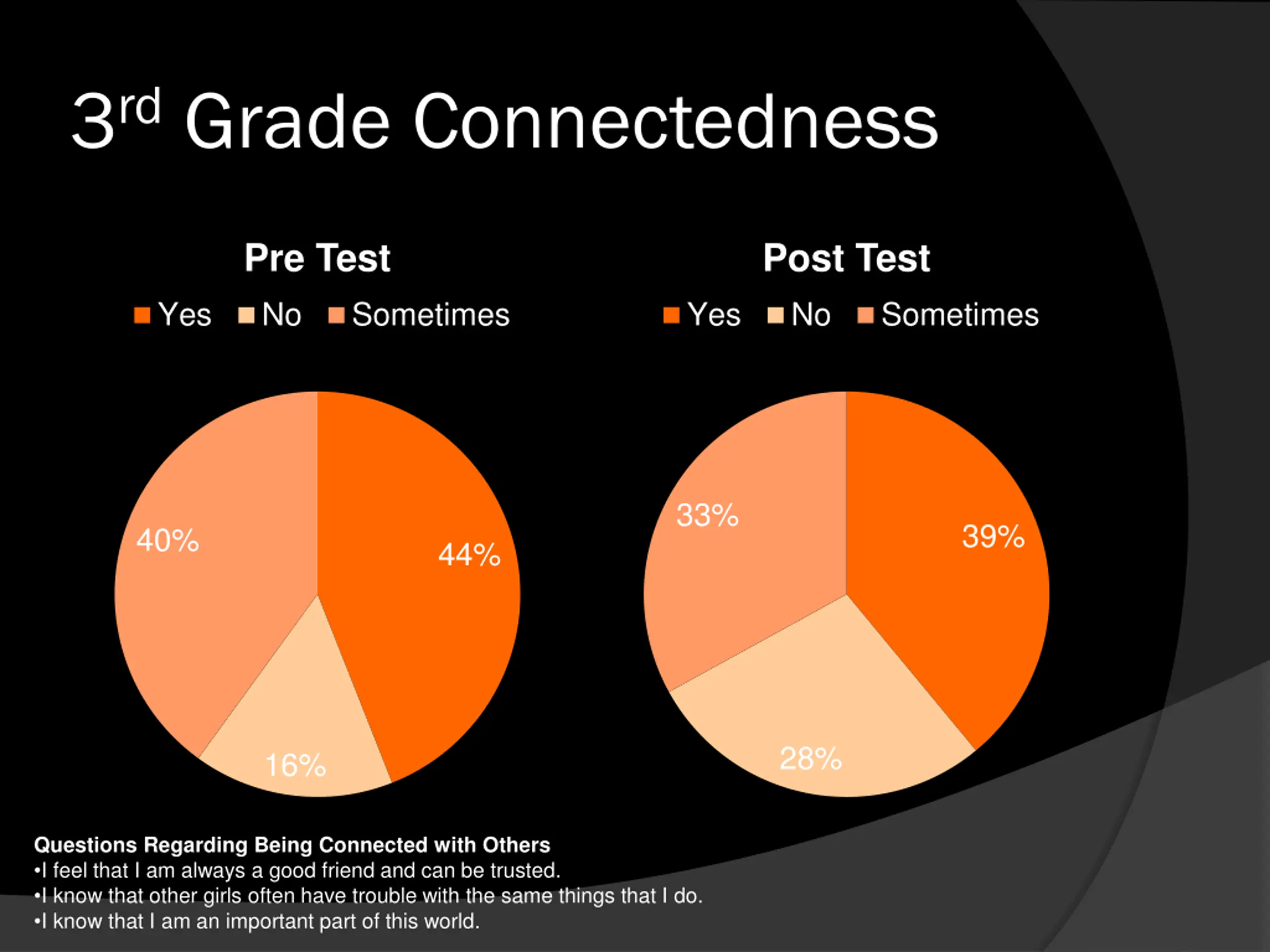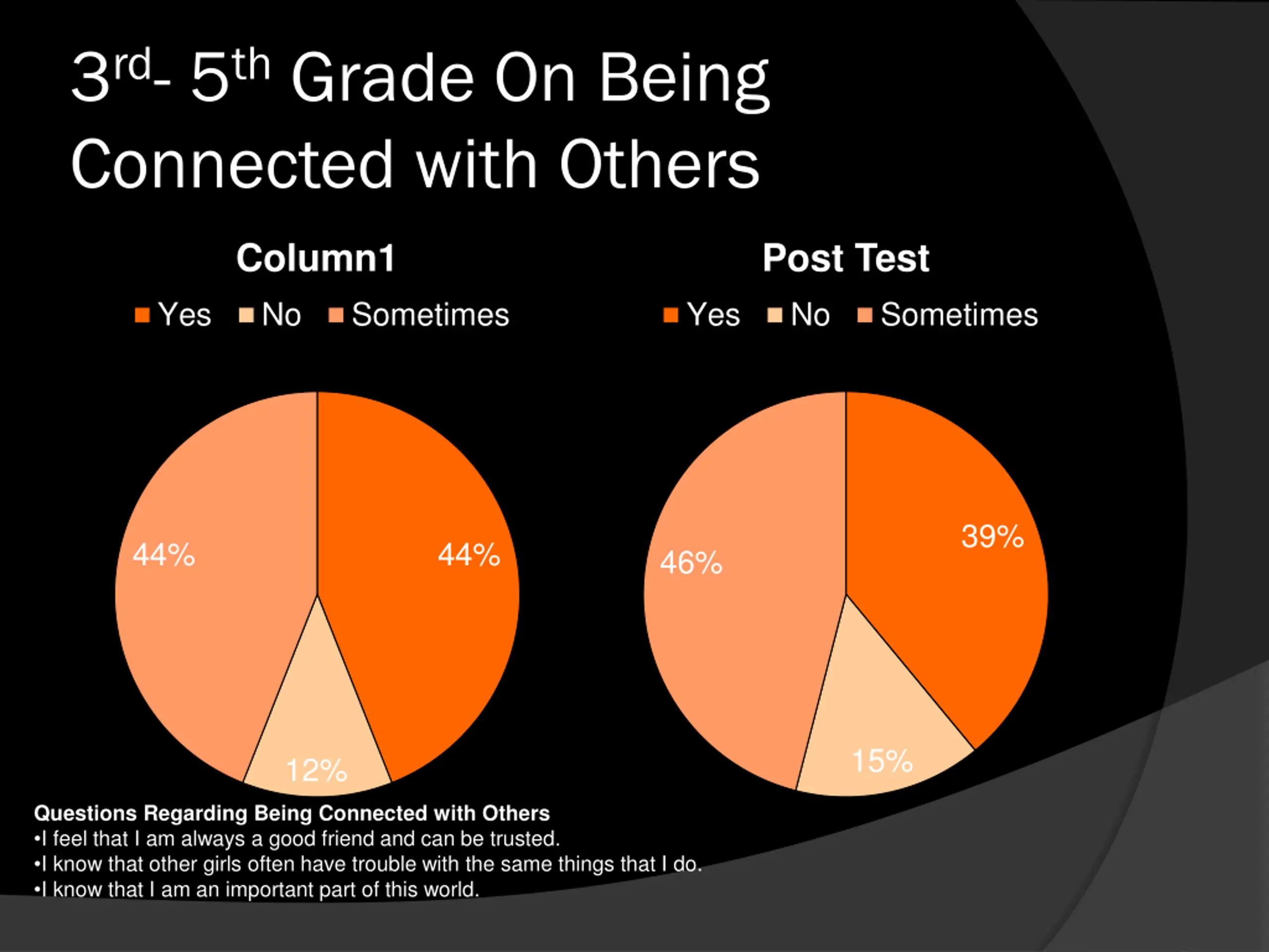 3rd- 5th Grade On Being Connected with Others Column1 No Post Test No Yes Sometimes Yes Sometimes 39% 44% 44% 46% 15% 12% Questions Regarding Being Connected with Others I feel that I am always a good friend and can be trusted. I know that other girls often have trouble with the same things that I do. I know that I am an important part of this world.