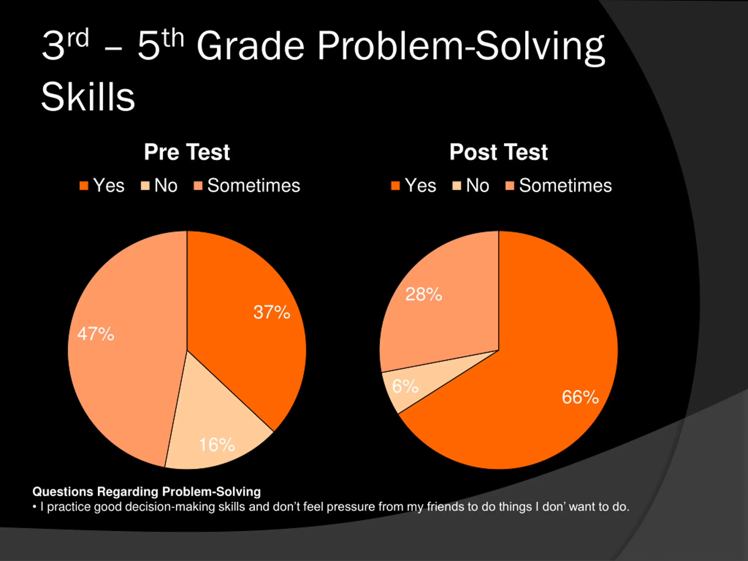 3rd 5th Grade Problem-Solving Skills Pre Test No Post Test No Yes Sometimes Yes Sometimes 28% 37% 47% 6% 66% 16% Questions Regarding Problem-Solving I practice good decision-making skills and don t feel pressure from my friends to do things I don want to do.