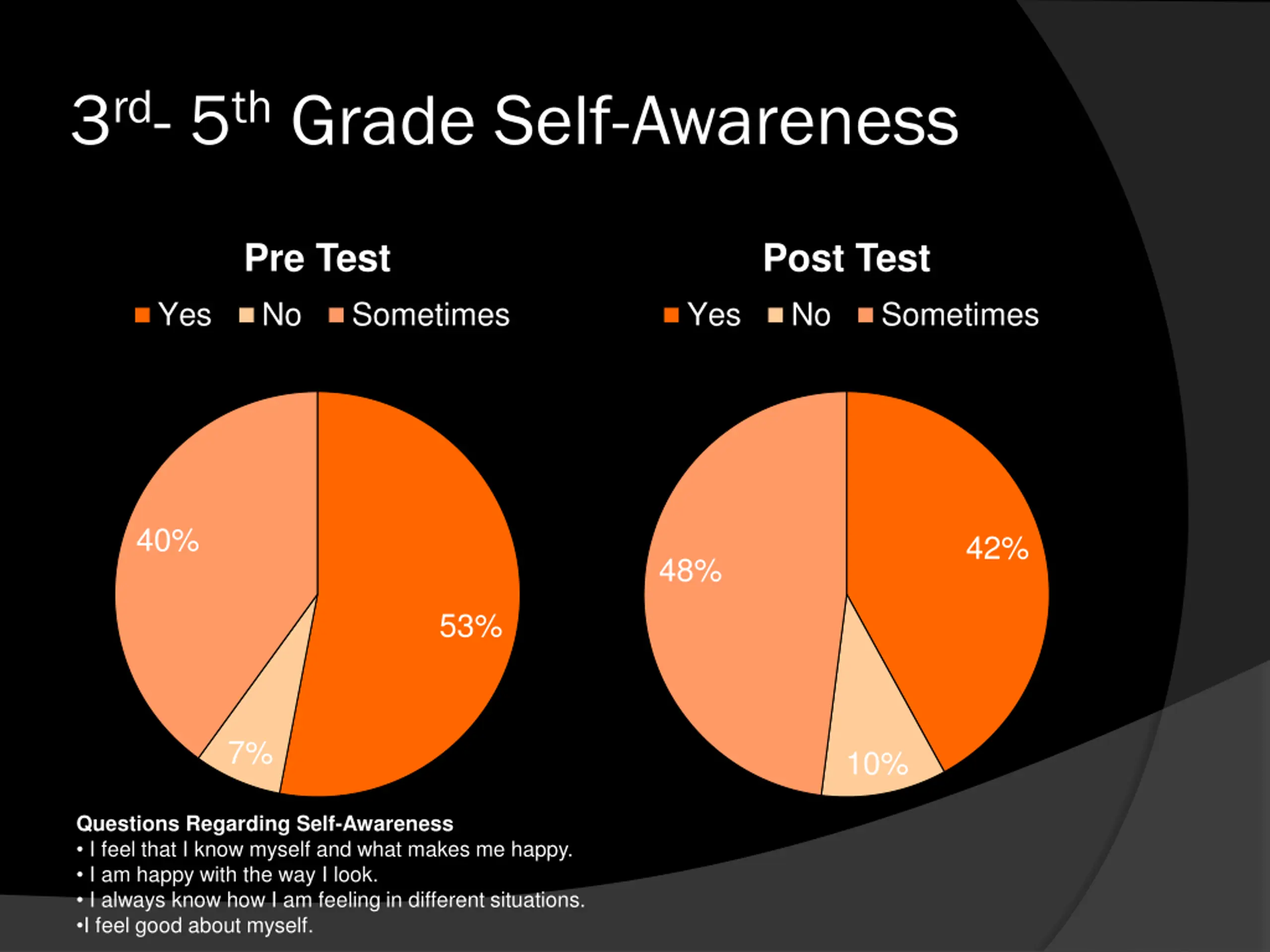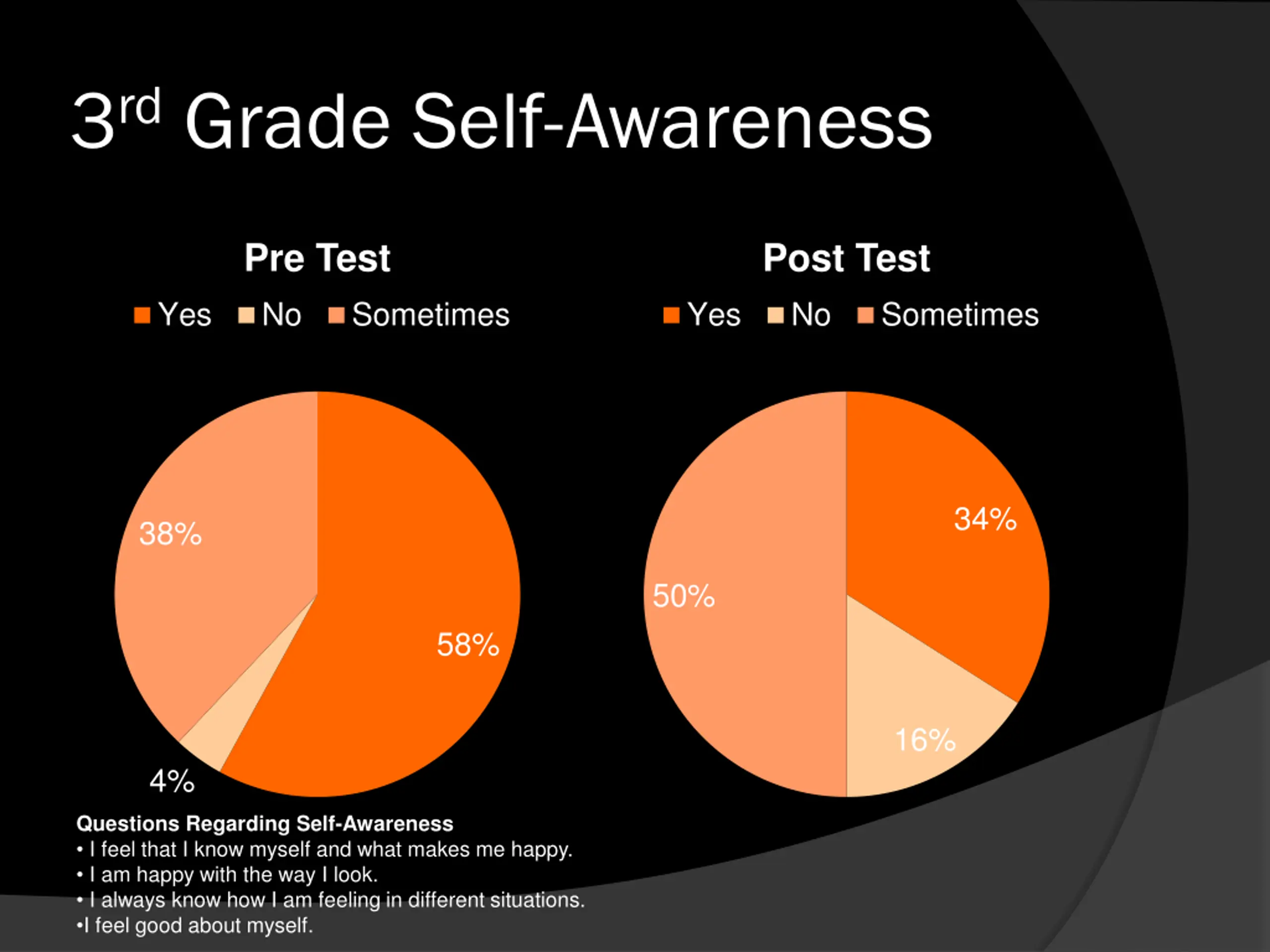 3rd Grade Self-Awareness Pre Test No Post Test No Yes Sometimes Yes Sometimes 34% 38% 50% 58% 16% 4% Questions Regarding Self-Awareness I feel that I know myself and what makes me happy. I am happy with the way I look. I always know how I am feeling in different situations. I feel good about myself.