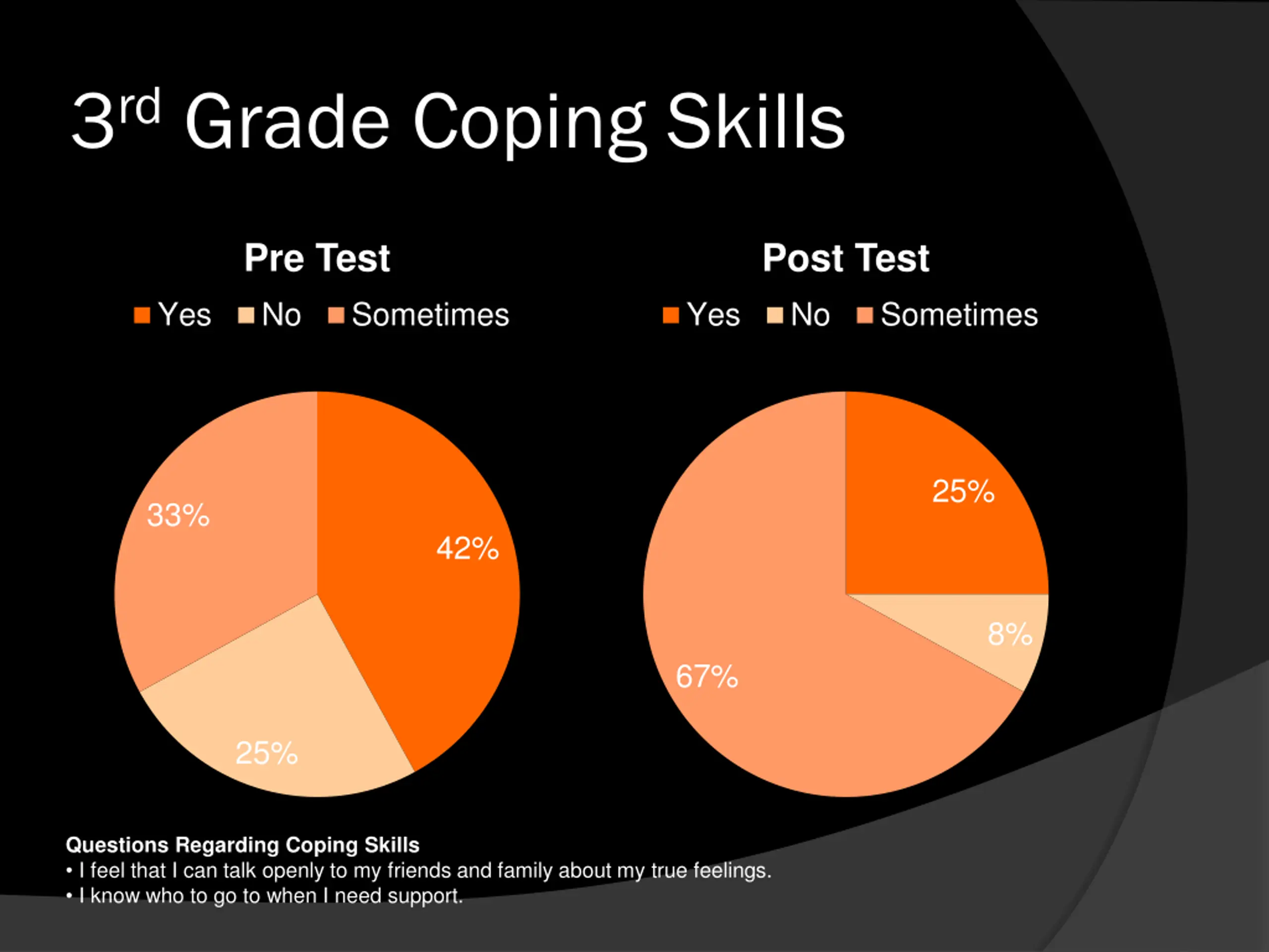 3rd Grade Coping Skills Pre Test No Post Test No Yes Sometimes Yes Sometimes 25% 33% 42% 8% 67% 25% Questions Regarding Coping Skills I feel that I can talk openly to my friends and family about my true feelings. I know who to go to when I need support.