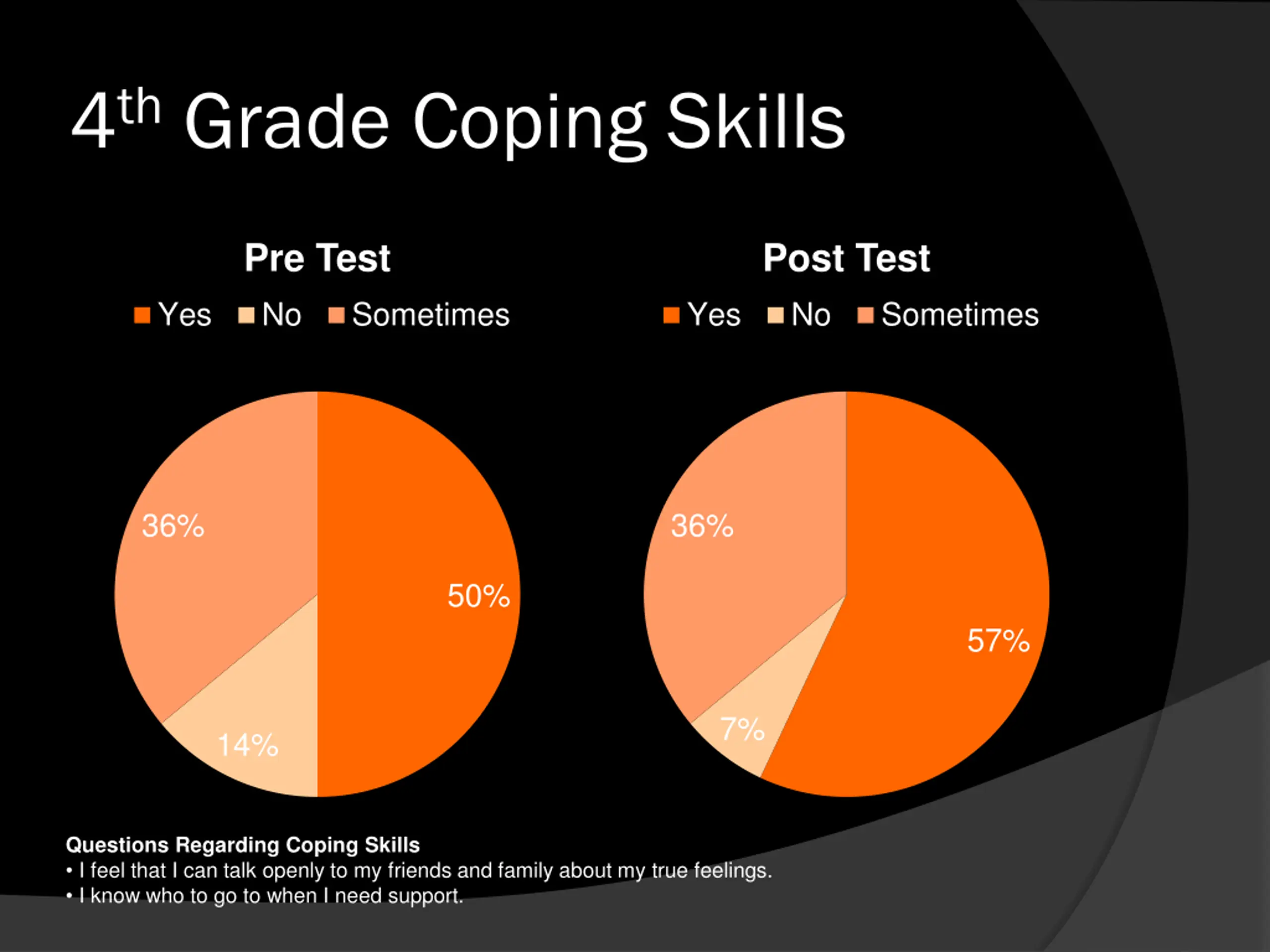 4th Grade Coping Skills Pre Test No Post Test No Yes Sometimes Yes Sometimes 36% 36% 50% 57% 7% 14% Questions Regarding Coping Skills I feel that I can talk openly to my friends and family about my true feelings. I know who to go to when I need support.