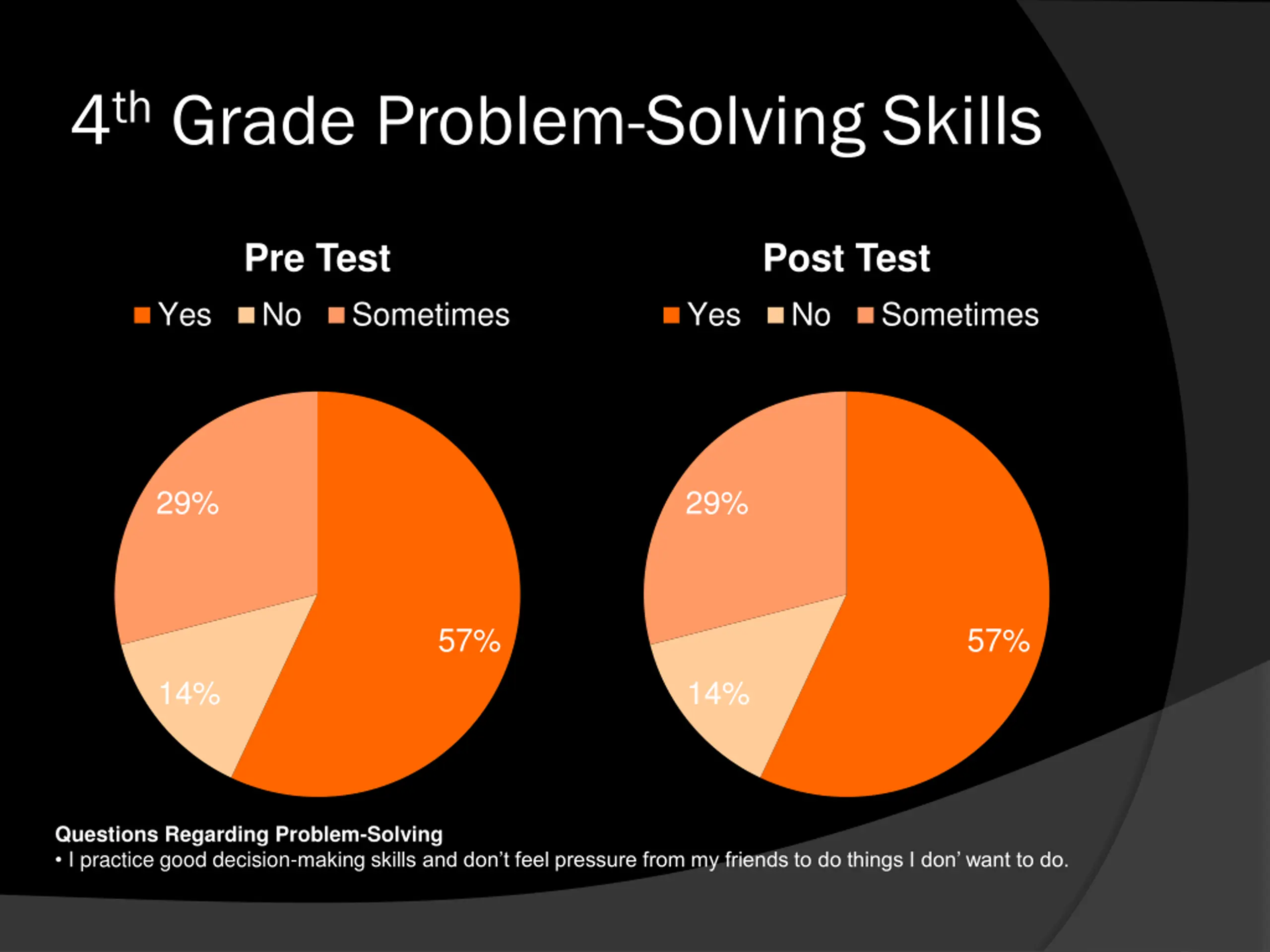 4th Grade Problem-Solving Skills Pre Test No Post Test No Yes Sometimes Yes Sometimes 29% 29% 57% 57% 14% 14% Questions Regarding Problem-Solving I practice good decision-making skills and don t feel pressure from my friends to do things I don want to do.