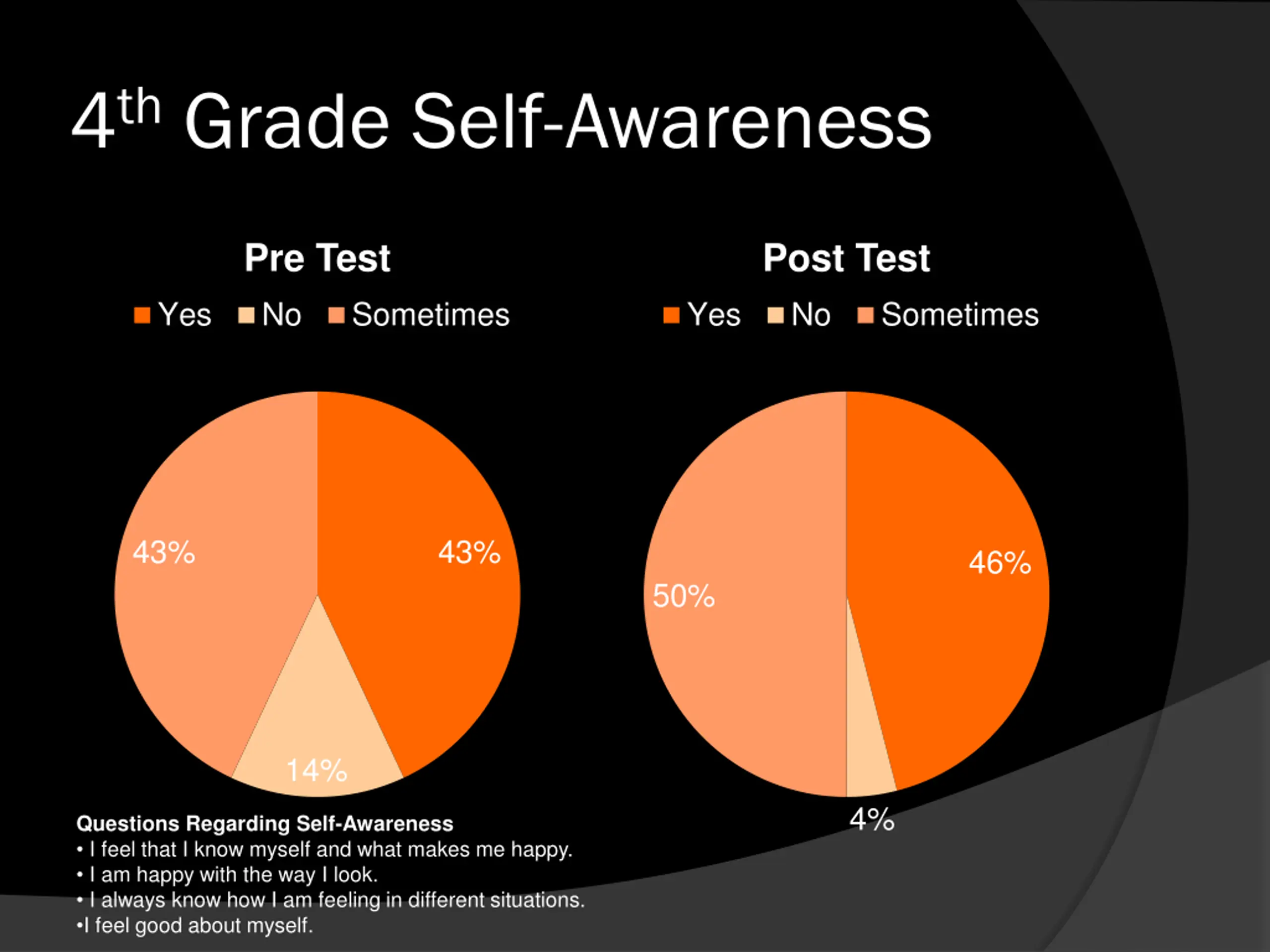 4th Grade Self-Awareness Pre Test No Post Test No Yes Sometimes Yes Sometimes 43% 43% 46% 50% 14% 4% Questions Regarding Self-Awareness I feel that I know myself and what makes me happy. I am happy with the way I look. I always know how I am feeling in different situations. I feel good about myself.