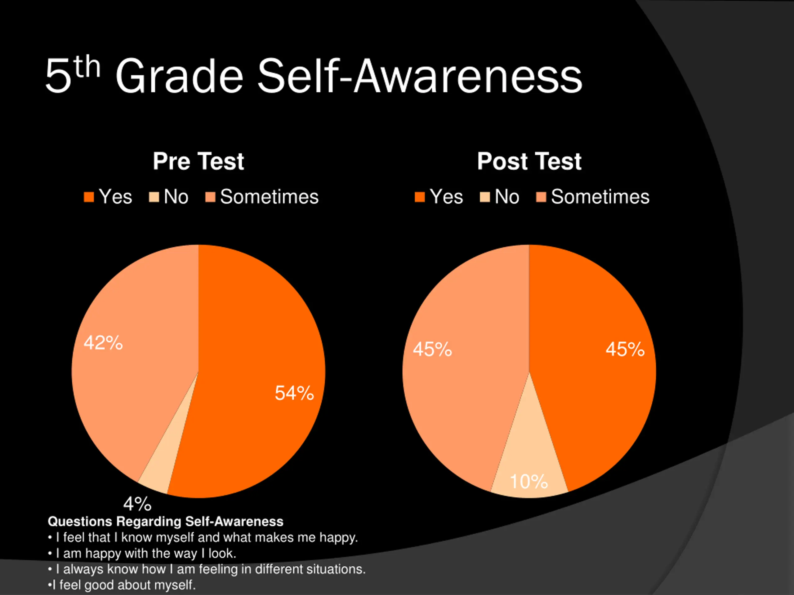 5th Grade Self-Awareness Pre Test No Post Test No Yes Sometimes Yes Sometimes 42% 45% 45% 54% 10% 4% Questions Regarding Self-Awareness I feel that I know myself and what makes me happy. I am happy with the way I look. I always know how I am feeling in different situations. I feel good about myself.