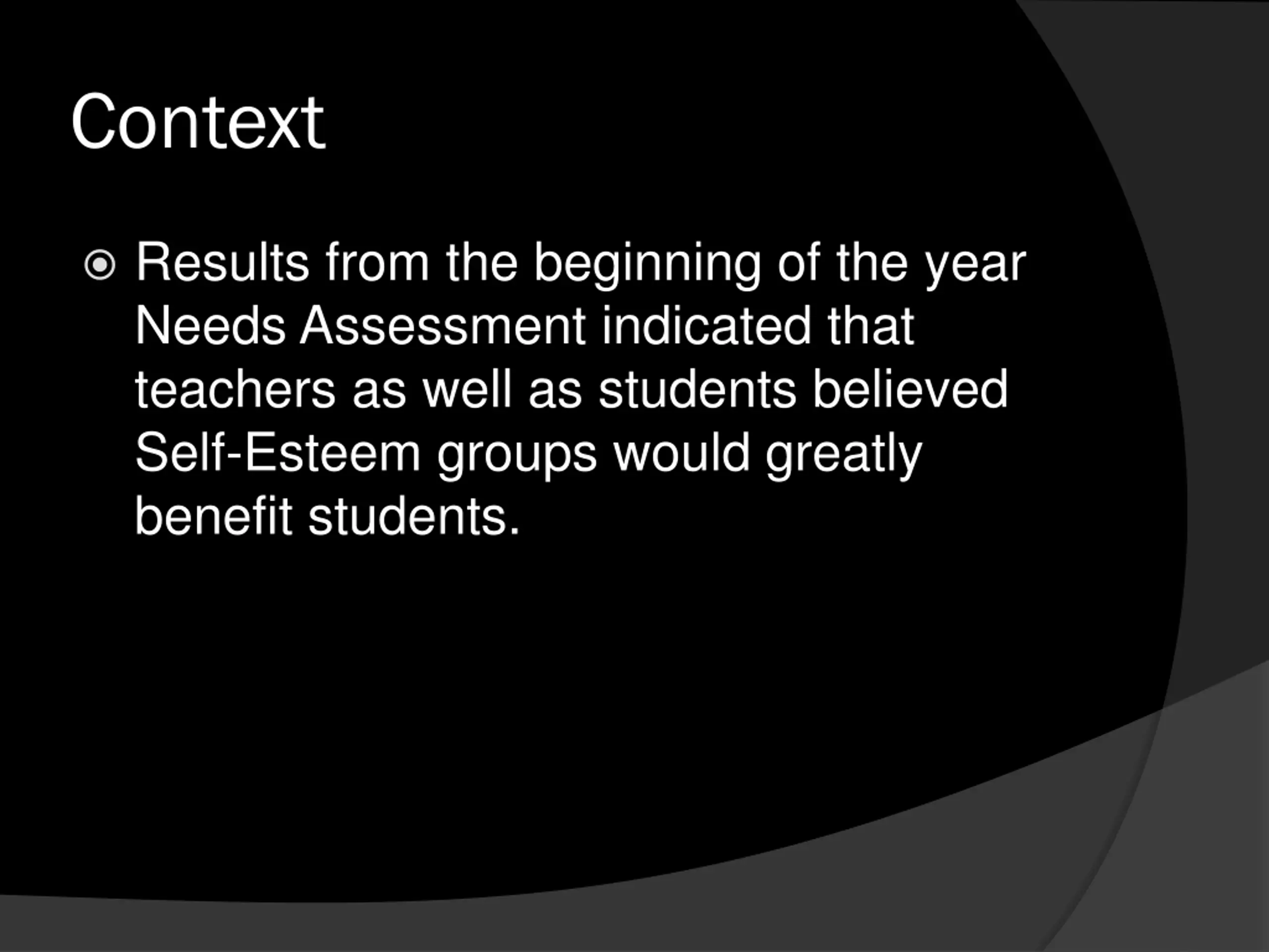 Context Results from the beginning of the year Needs Assessment indicated that teachers as well as students believed Self-Esteem groups would greatly benefit students.