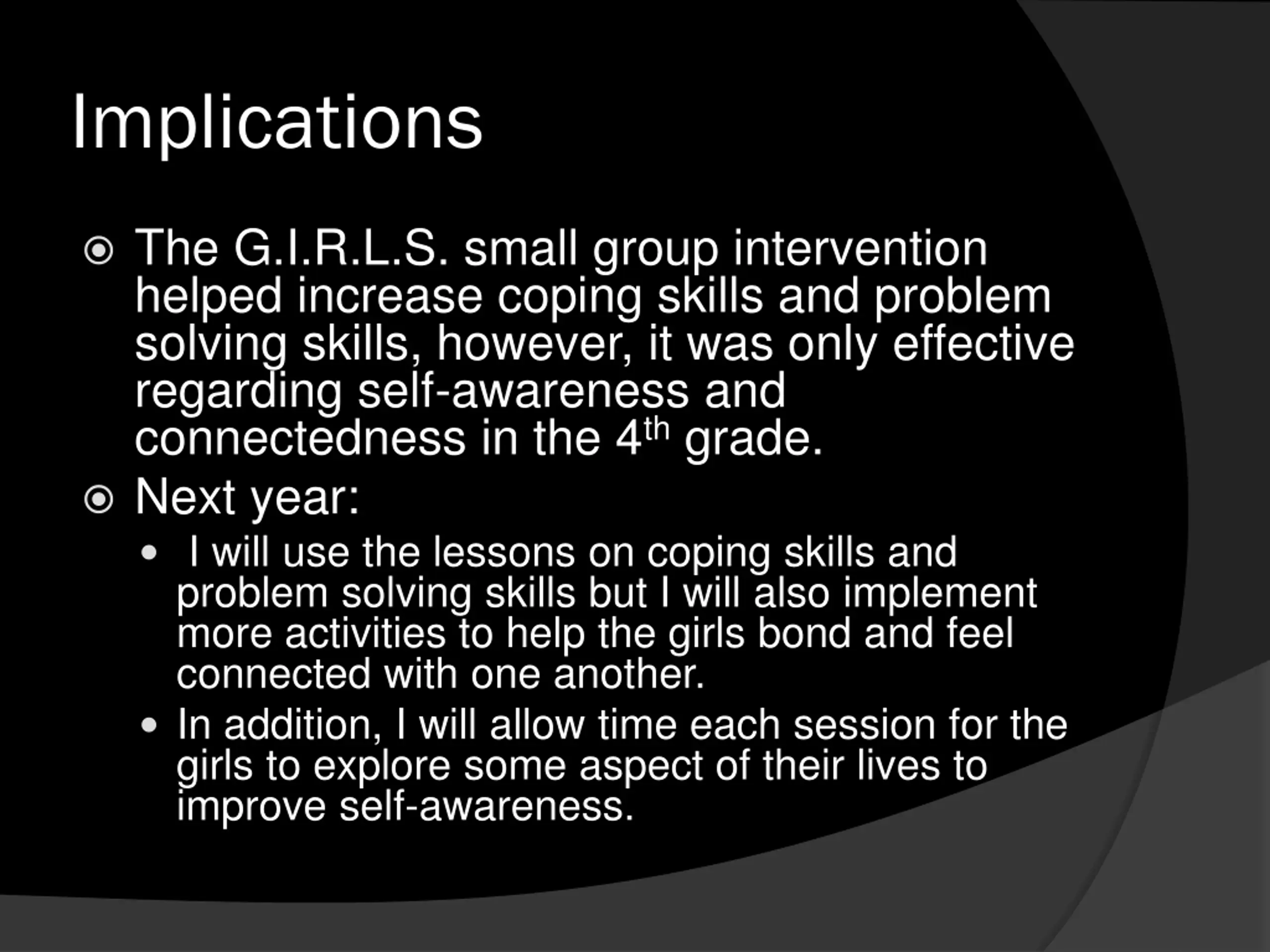 Implications The G.I.R.L.S. small group intervention helped increase coping skills and problem solving skills, however, it was only effective regarding self-awareness and connectedness in the 4th grade. Next year: I will use the lessons on coping skills and problem solving skills but I will also implement more activities to help the girls bond and feel connected with one another. In addition, I will allow time each session for the girls to explore some aspect of their lives to improve self-awareness.