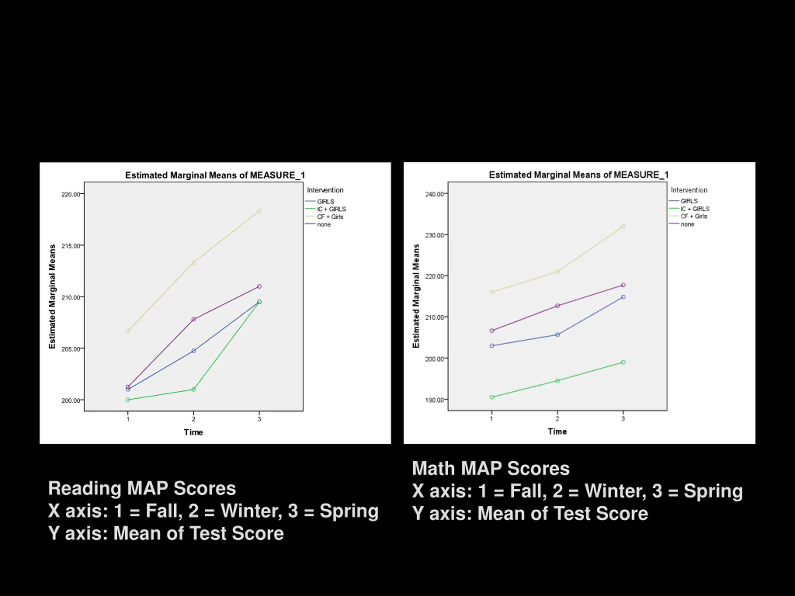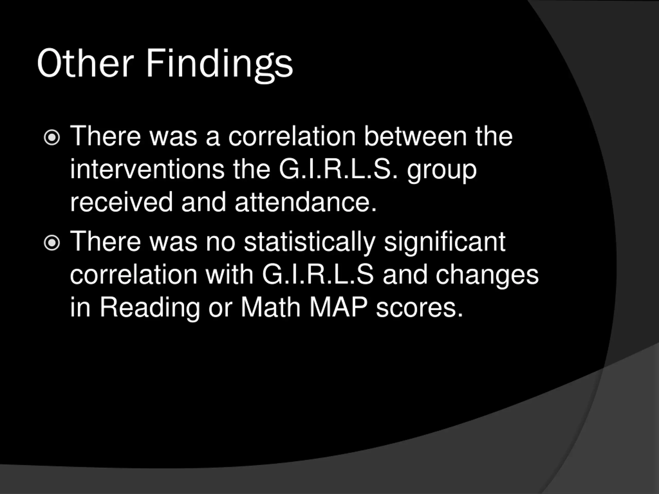 Other Findings There was a correlation between the interventions the G.I.R.L.S. group received and attendance. There was no statistically significant correlation with G.I.R.L.S and changes in Reading or Math MAP scores.