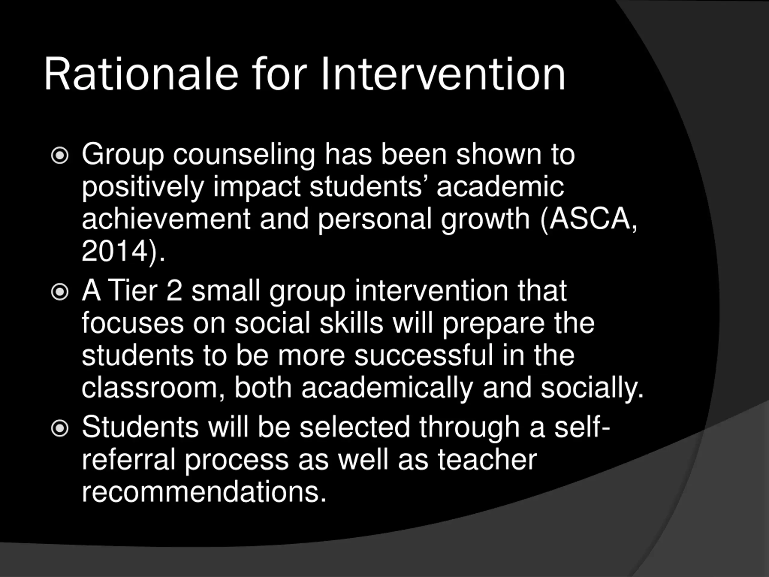 Rationale for Intervention Group counseling has been shown to positively impact students academic achievement and personal growth (ASCA, 2014). A Tier 2 small group intervention that focuses on social skills will prepare the students to be more successful in the classroom, both academically and socially. Students will be selected through a self- referral process as well as teacher recommendations.
