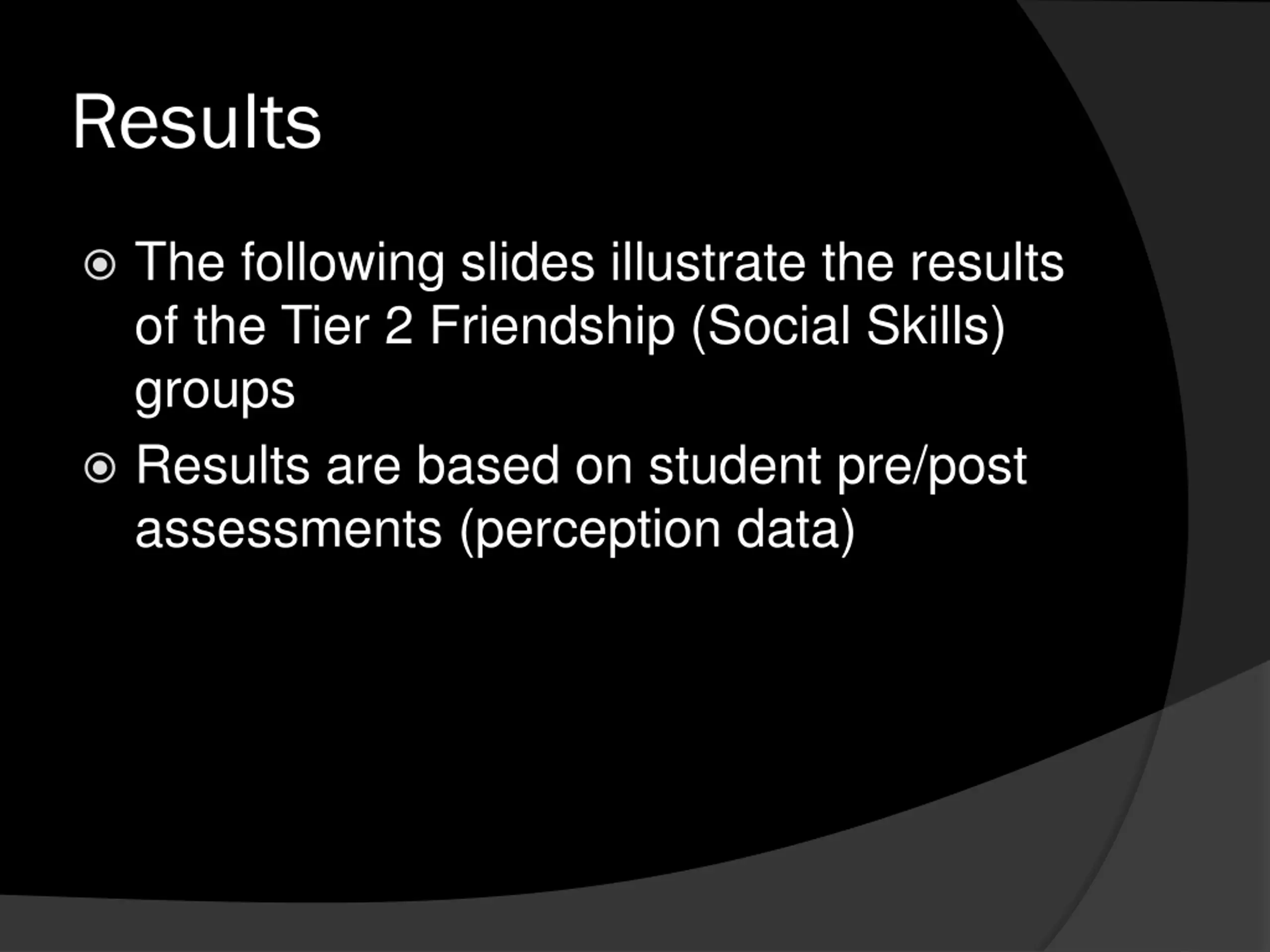 Results The following slides illustrate the results of the Tier 2 Friendship (Social Skills) groups Results are based on student pre/post assessments (perception data)