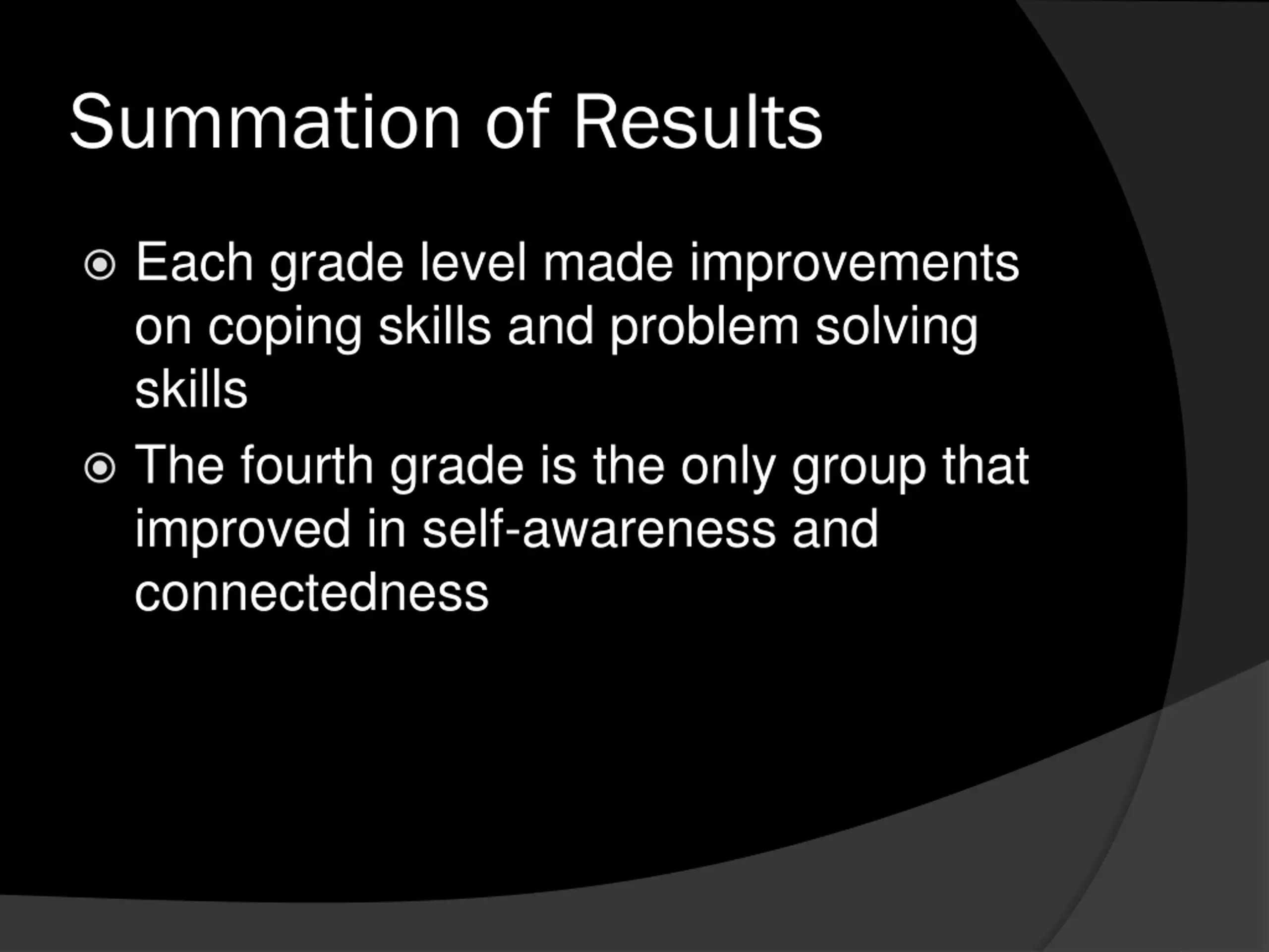 Summation of Results Each grade level made improvements on coping skills and problem solving skills The fourth grade is the only group that improved in self-awareness and connectedness