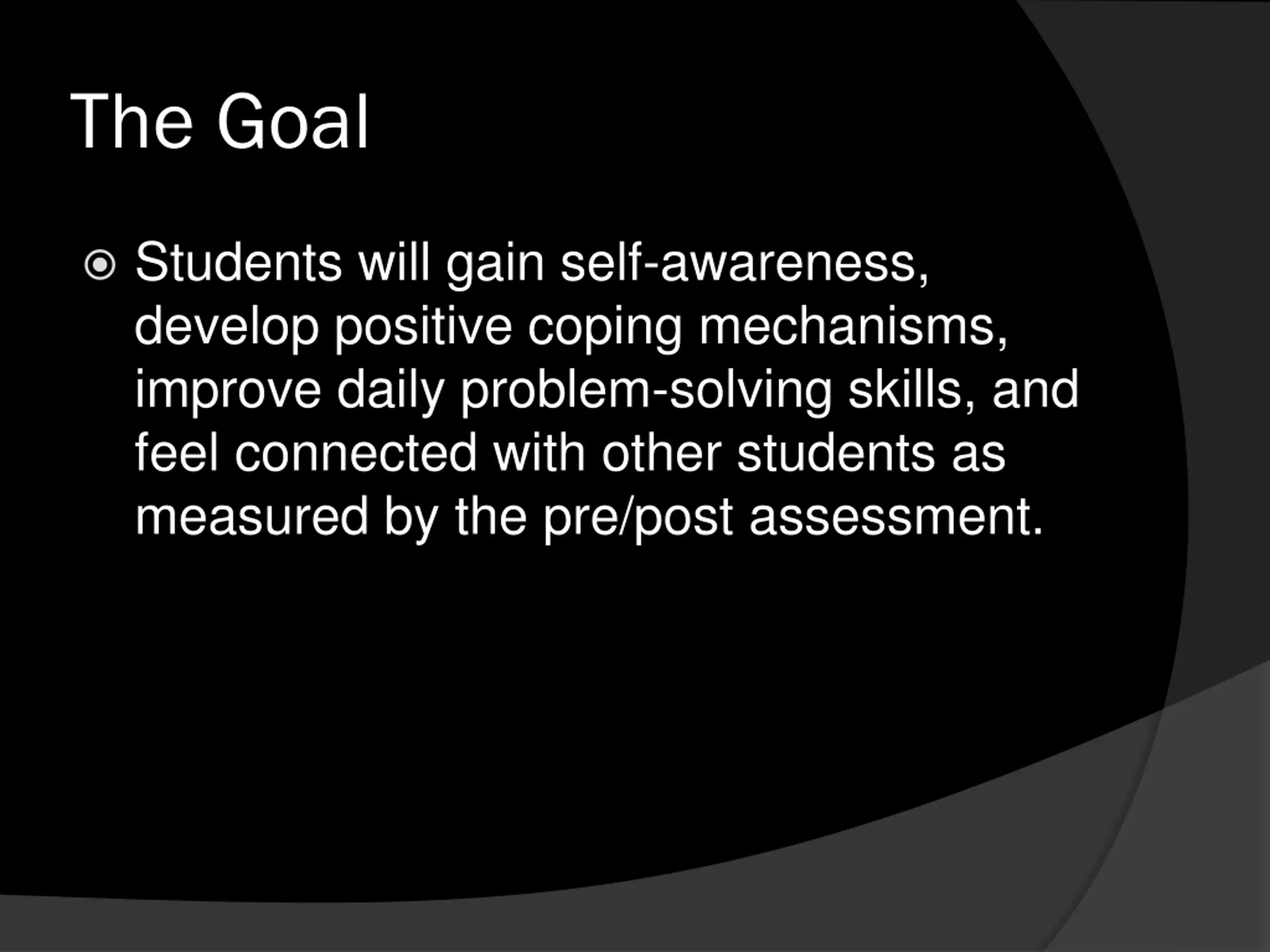 The Goal Students will gain self-awareness, develop positive coping mechanisms, improve daily problem-solving skills, and feel connected with other students as measured by the pre/post assessment.