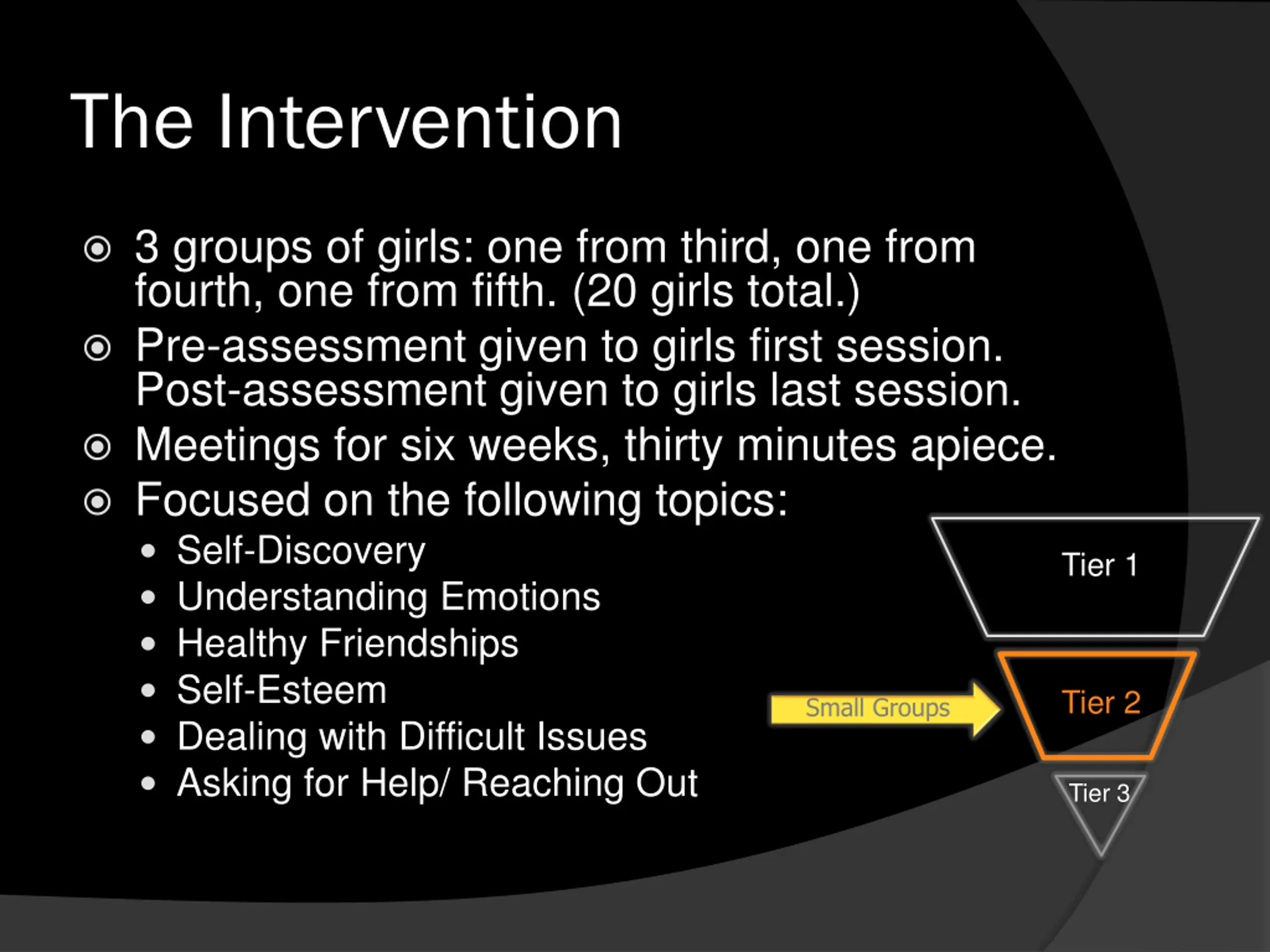The Intervention 3 groups of girls: one from third, one from fourth, one from fifth. (20 girls total.) Pre-assessment given to girls first session. Post-assessment given to girls last session. Meetings for six weeks, thirty minutes apiece. Focused on the following topics: Self-Discovery Understanding Emotions Healthy Friendships Self-Esteem Dealing with Difficult Issues Asking for Help/ Reaching Out Tier 1 Tier 2 Small Groups Tier 3