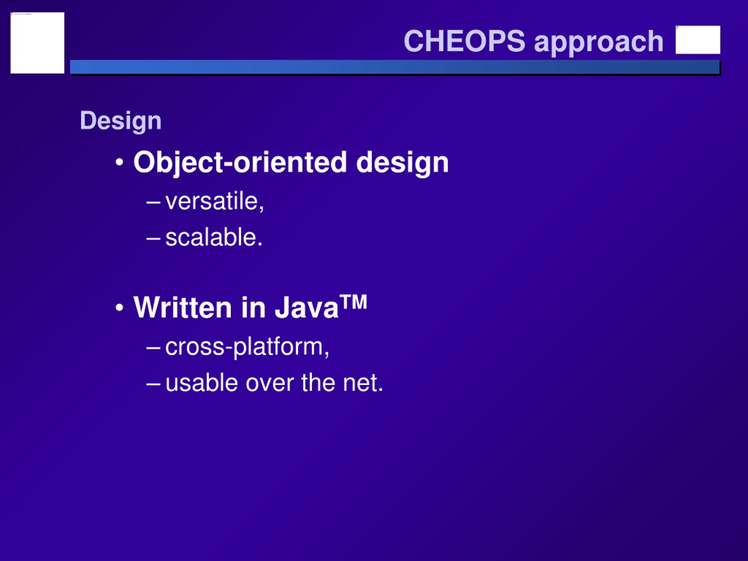 CHEOPS approach Design Object-oriented design versatile, scalable. Written in JavaTM cross-platform, usable over the net.