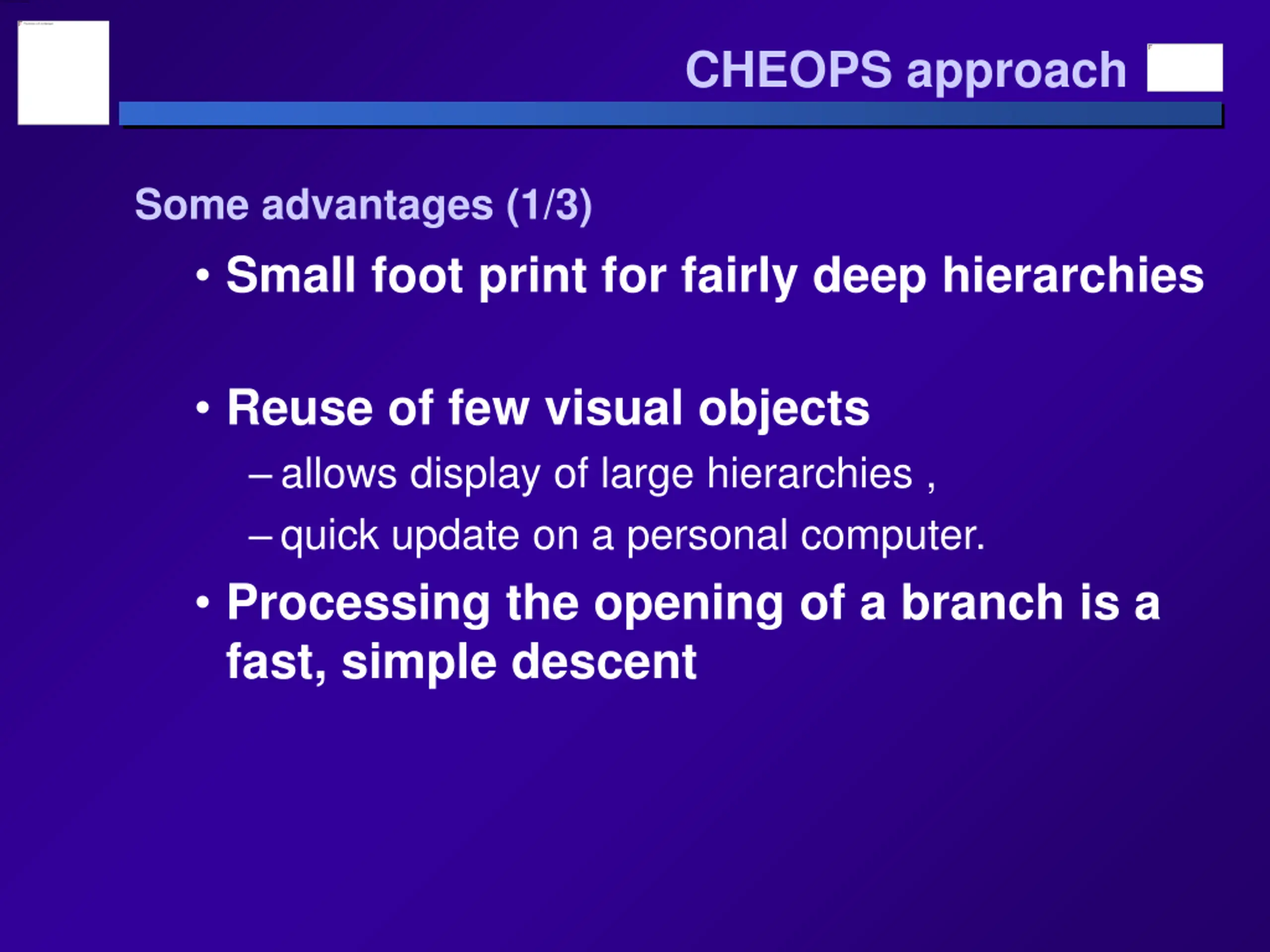 CHEOPS approach Some advantages (1/3) Small foot print for fairly deep hierarchies Reuse of few visual objects allows display of large hierarchies , quick update on a personal computer. Processing the opening of a branch is a fast, simple descent