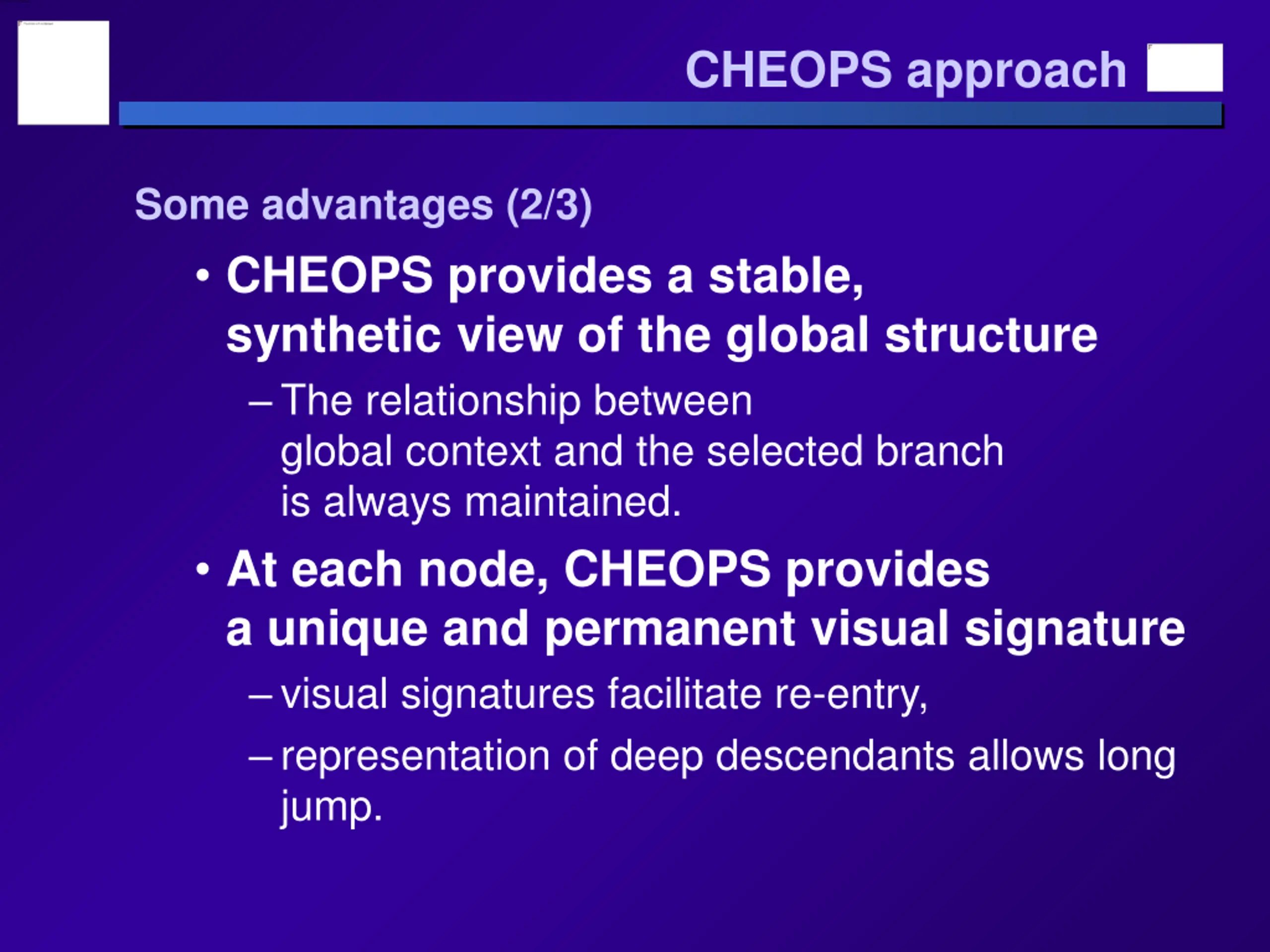 CHEOPS approach Some advantages (2/3) CHEOPS provides a stable, synthetic view of the global structure The relationship between global context and the selected branch is always maintained. At each node, CHEOPS provides a unique and permanent visual signature visual signatures facilitate re-entry, representation of deep descendants allows long jump.