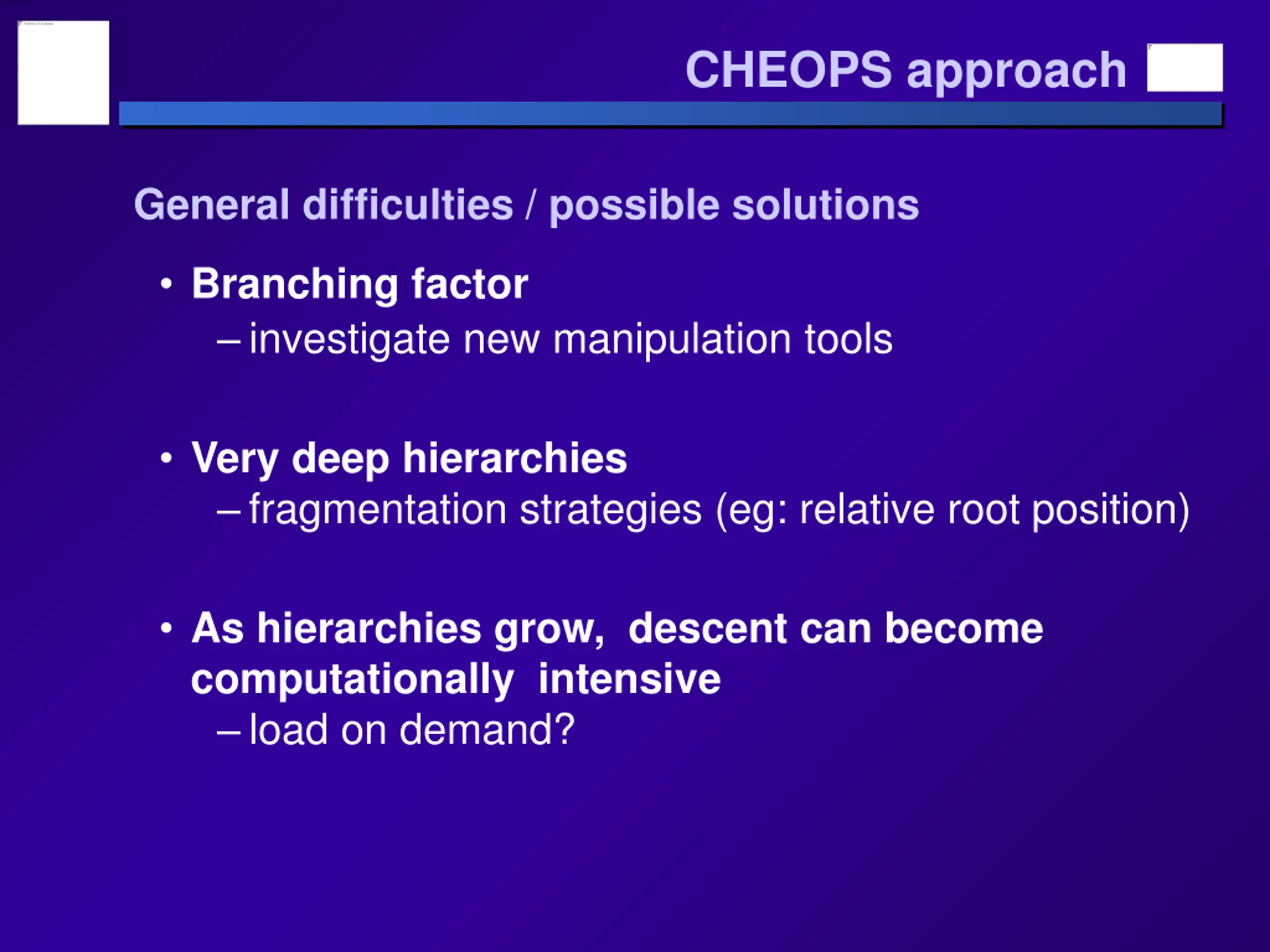 CHEOPS approach General difficulties / possible solutions Branching factor investigate new manipulation tools Very deep hierarchies fragmentation strategies (eg: relative root position) As hierarchies grow, descent can become computationally intensive load on demand?