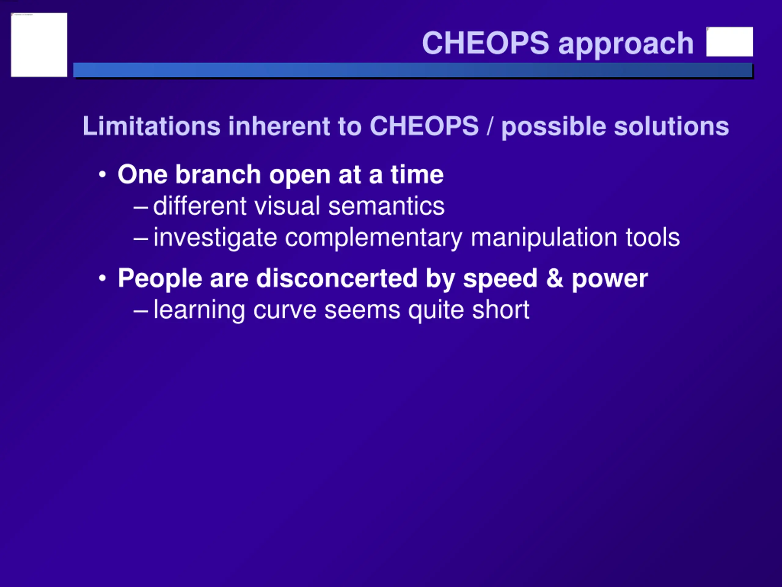 CHEOPS approach Limitations inherent to CHEOPS / possible solutions One branch open at a time different visual semantics investigate complementary manipulation tools People are disconcerted by speed & power learning curve seems quite short