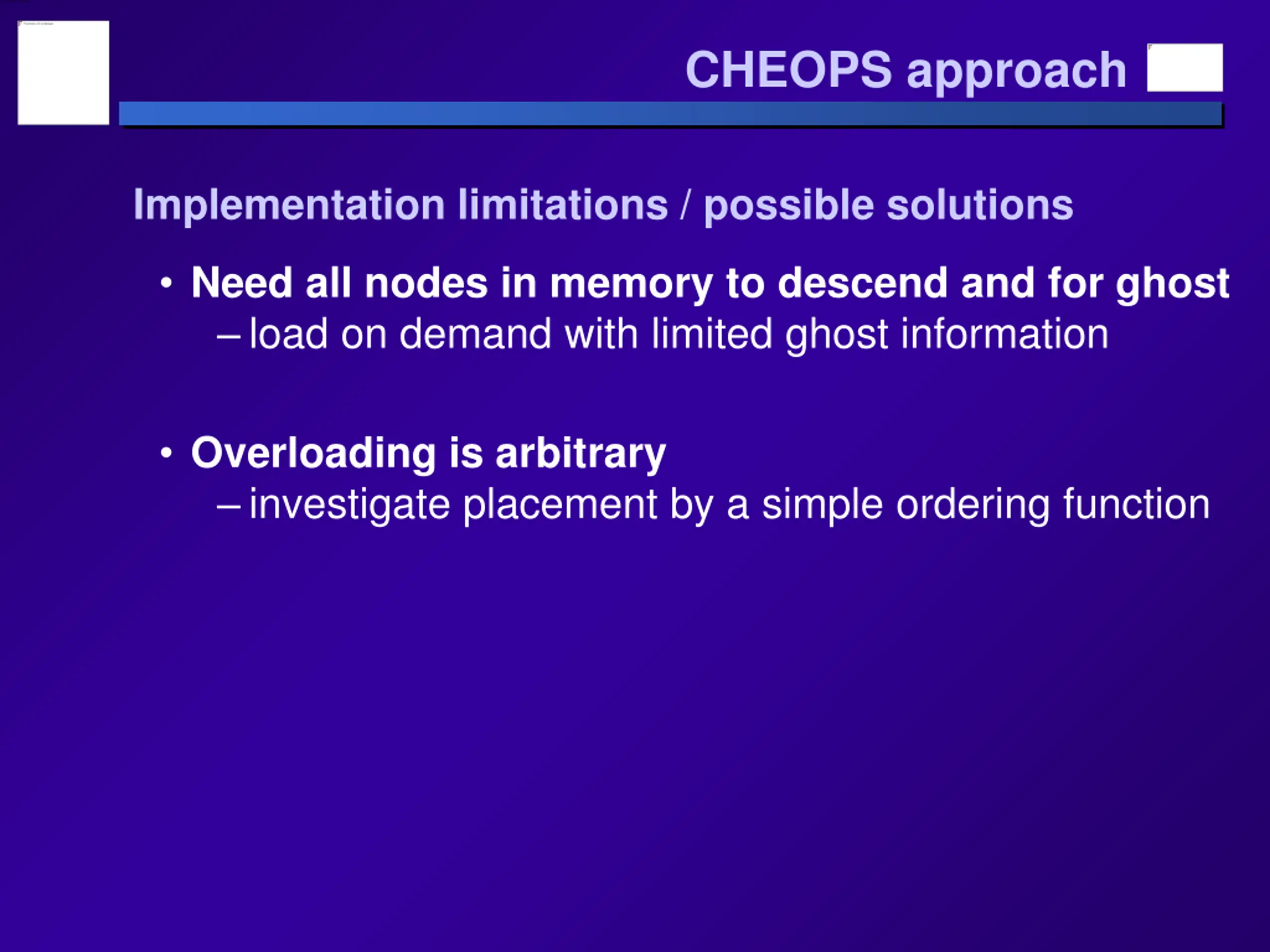 CHEOPS approach Implementation limitations / possible solutions Need all nodes in memory to descend and for ghost load on demand with limited ghost information Overloading is arbitrary investigate placement by a simple ordering function