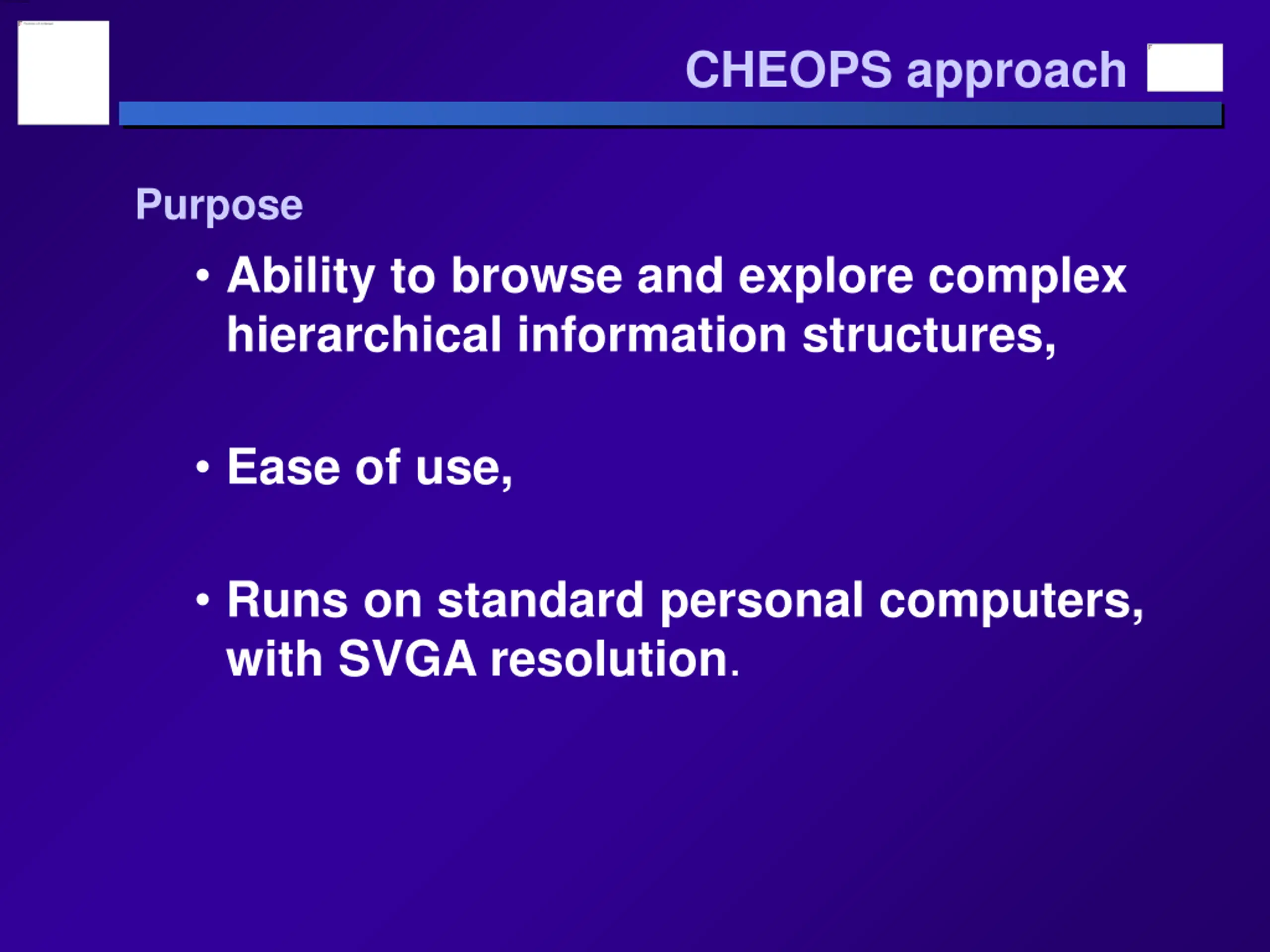 CHEOPS approach Purpose Ability to browse and explore complex hierarchical information structures, Ease of use, Runs on standard personal computers, with SVGA resolution.