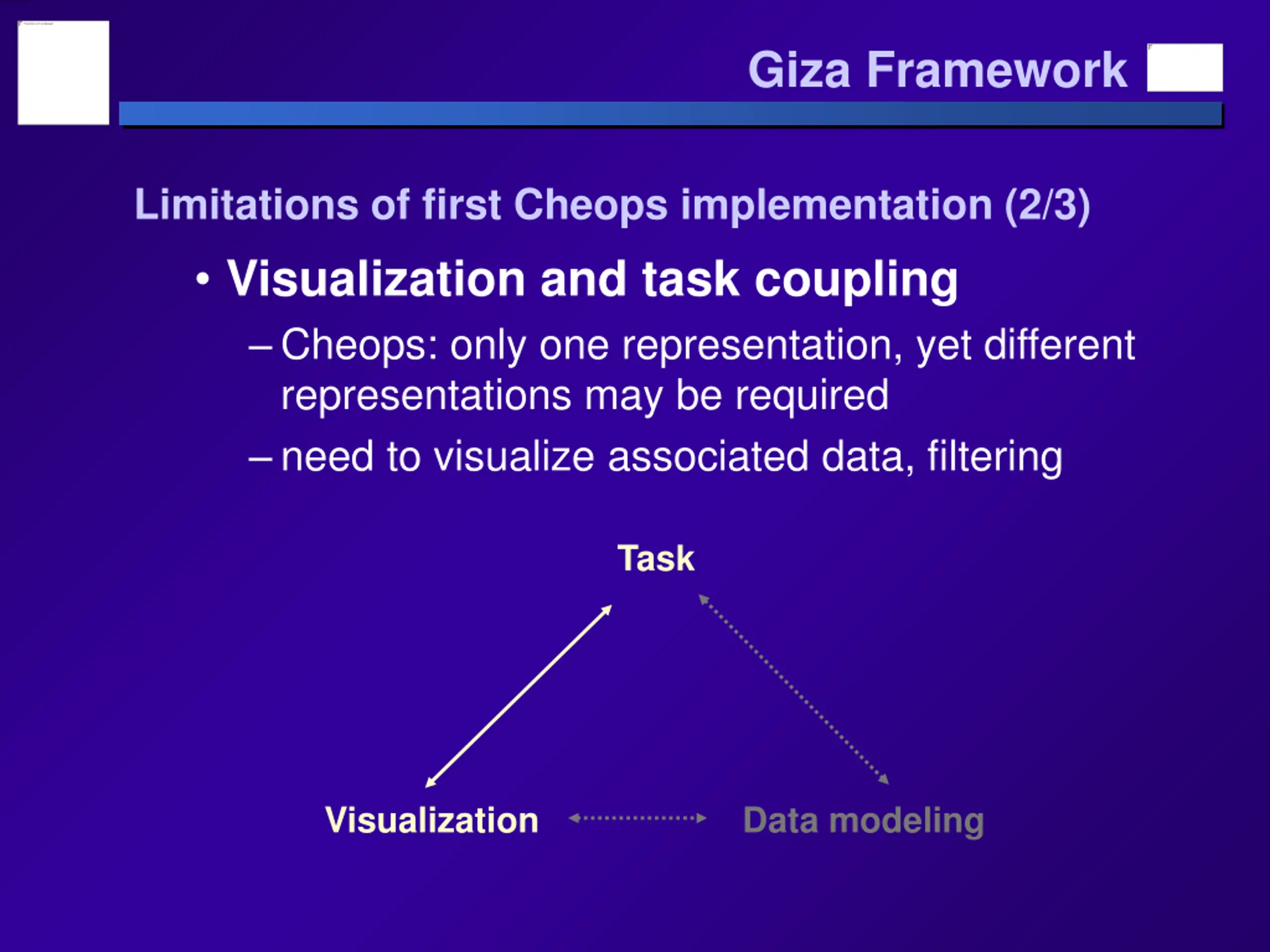 Giza Framework Limitations of first Cheops implementation (2/3) Visualization and task coupling Cheops: only one representation, yet different representations may be required need to visualize associated data, filtering Task Visualization Data modeling