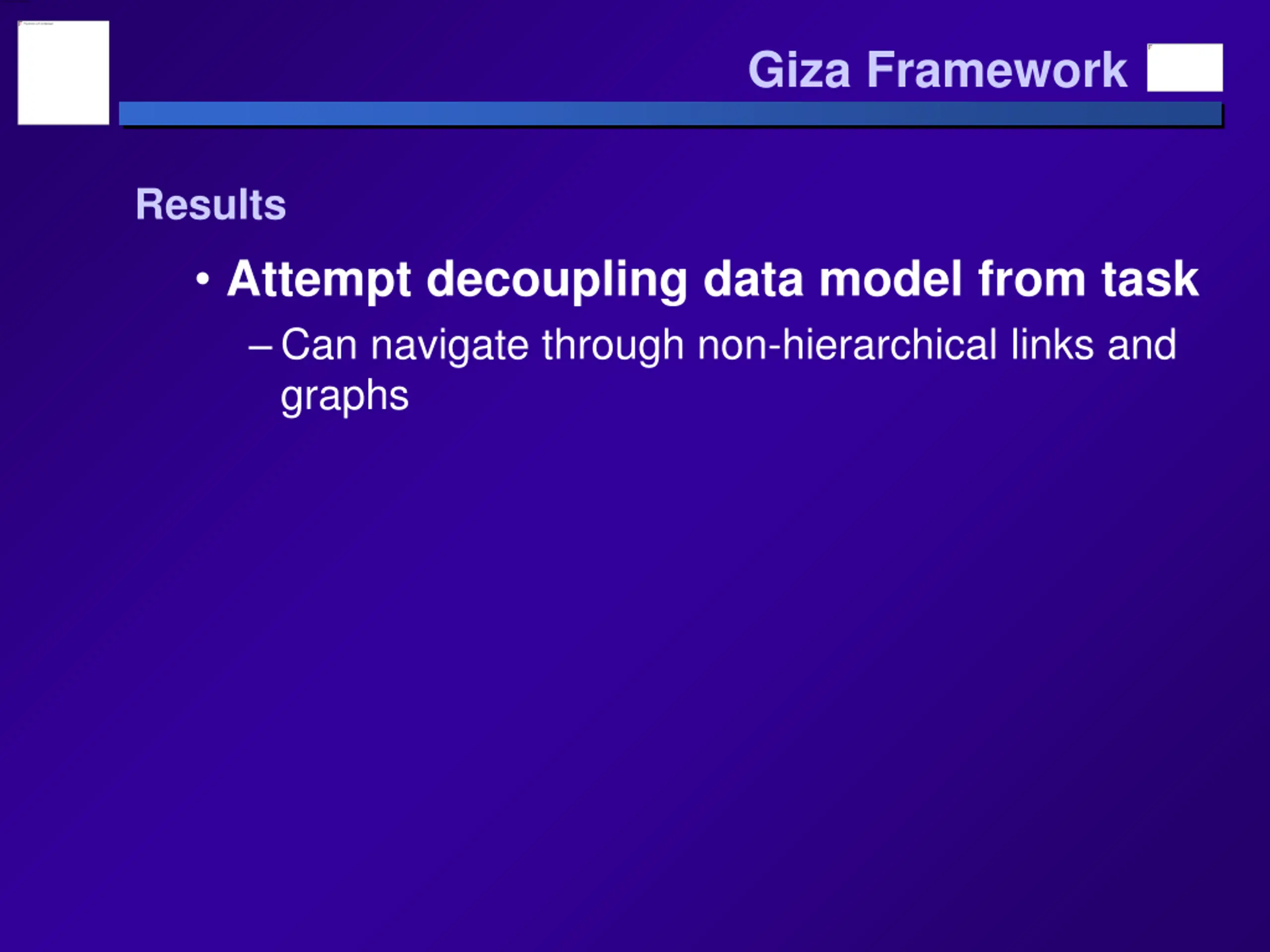Giza Framework Results Attempt decoupling data model from task Can navigate through non-hierarchical links and graphs