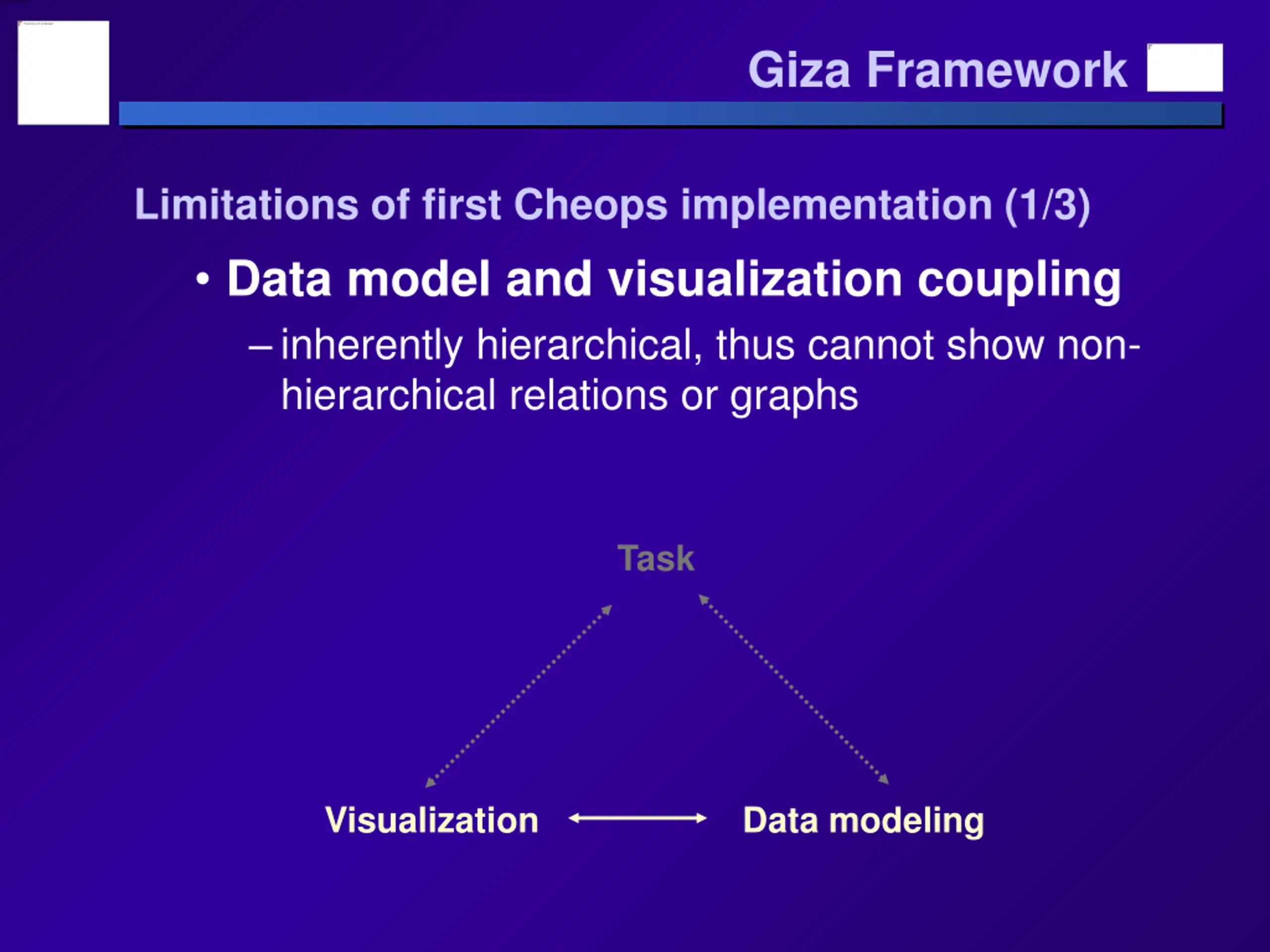 Giza Framework Limitations of first Cheops implementation (1/3) Data model and visualization coupling inherently hierarchical, thus cannot show non- hierarchical relations or graphs Task Visualization Data modeling