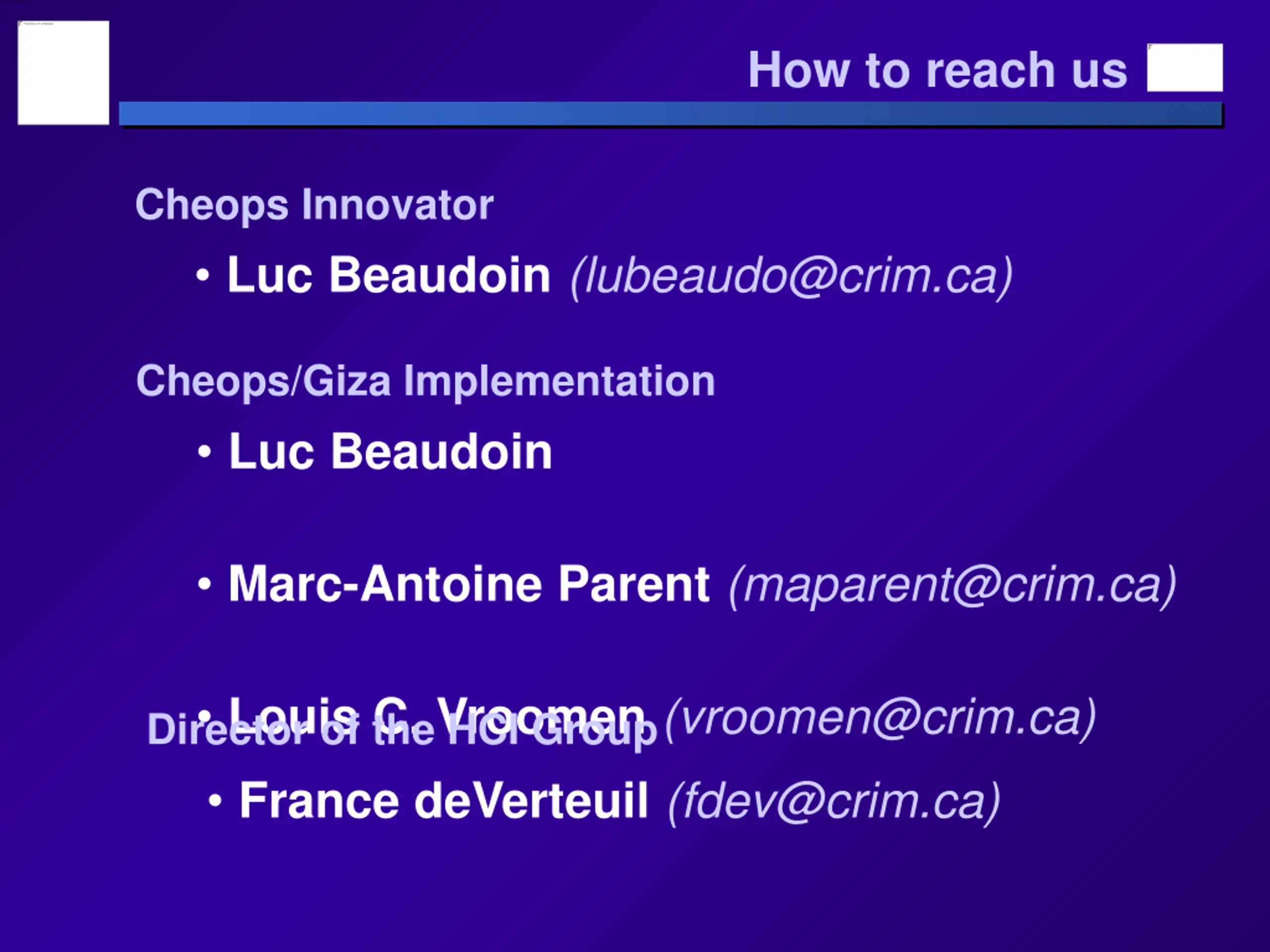How to reach us Cheops Innovator Luc Beaudoin (lubeaudo@crim.ca) Cheops/Giza Implementation Luc Beaudoin Marc-Antoine Parent (maparent@crim.ca) Louis C. Vroomen (vroomen@crim.ca) Director of the HCI Group France deVerteuil (fdev@crim.ca)