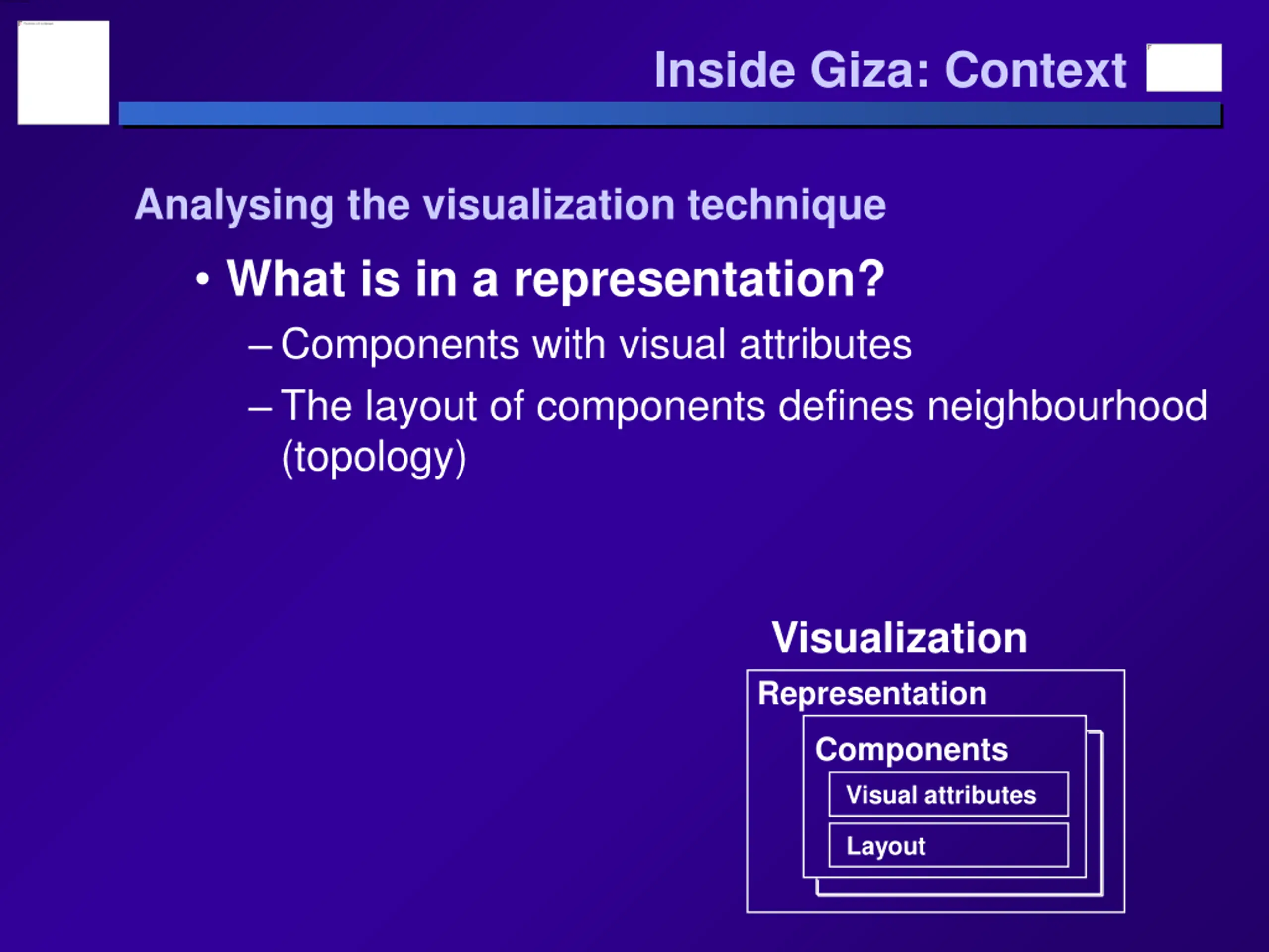 Inside Giza: Context Analysing the visualization technique What is in a representation? Components with visual attributes The layout of components defines neighbourhood (topology) Visualization Representation Components Visual attributes Layout