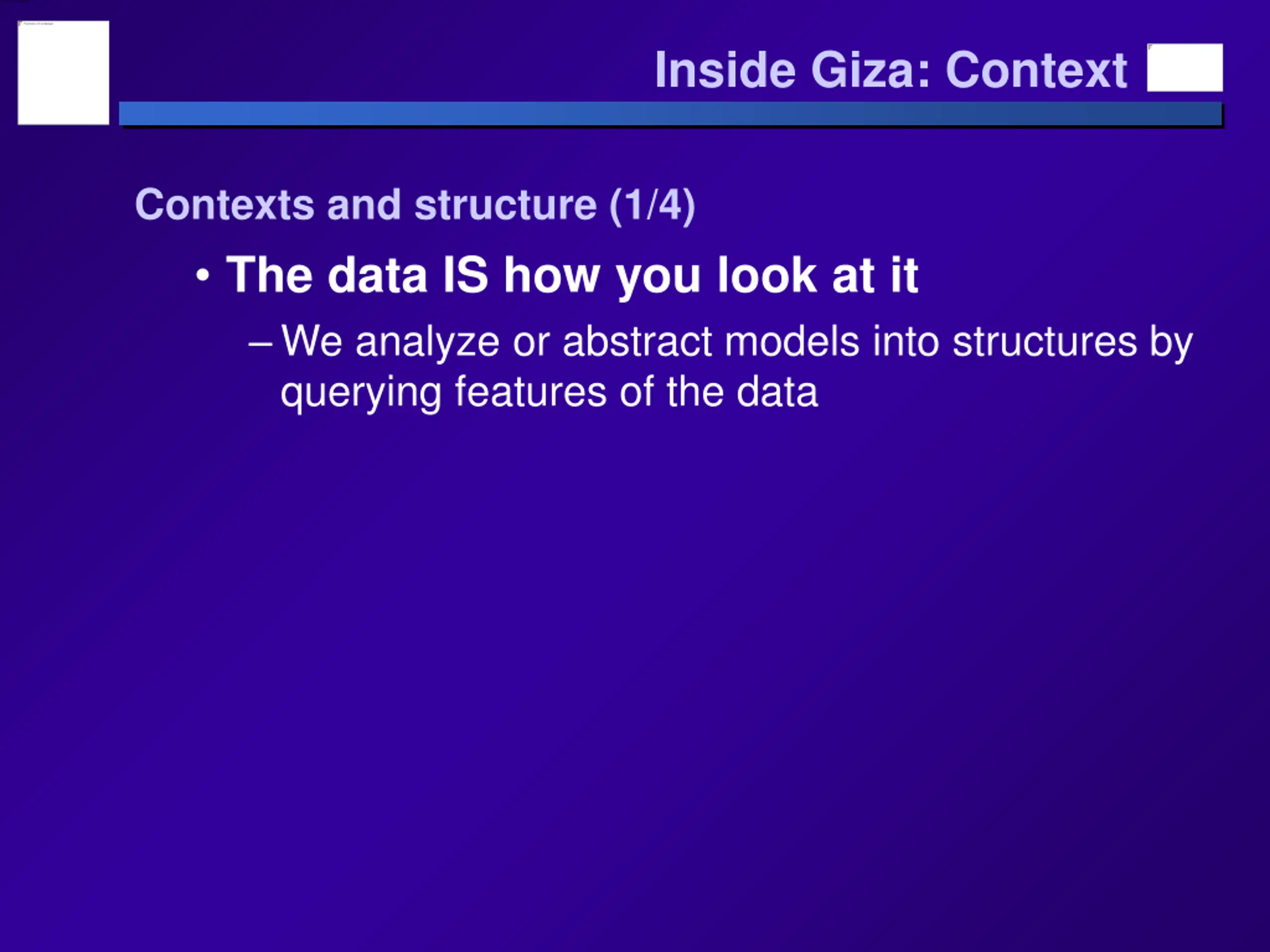 Inside Giza: Context Contexts and structure (1/4) The data IS how you look at it We analyze or abstract models into structures by querying features of the data