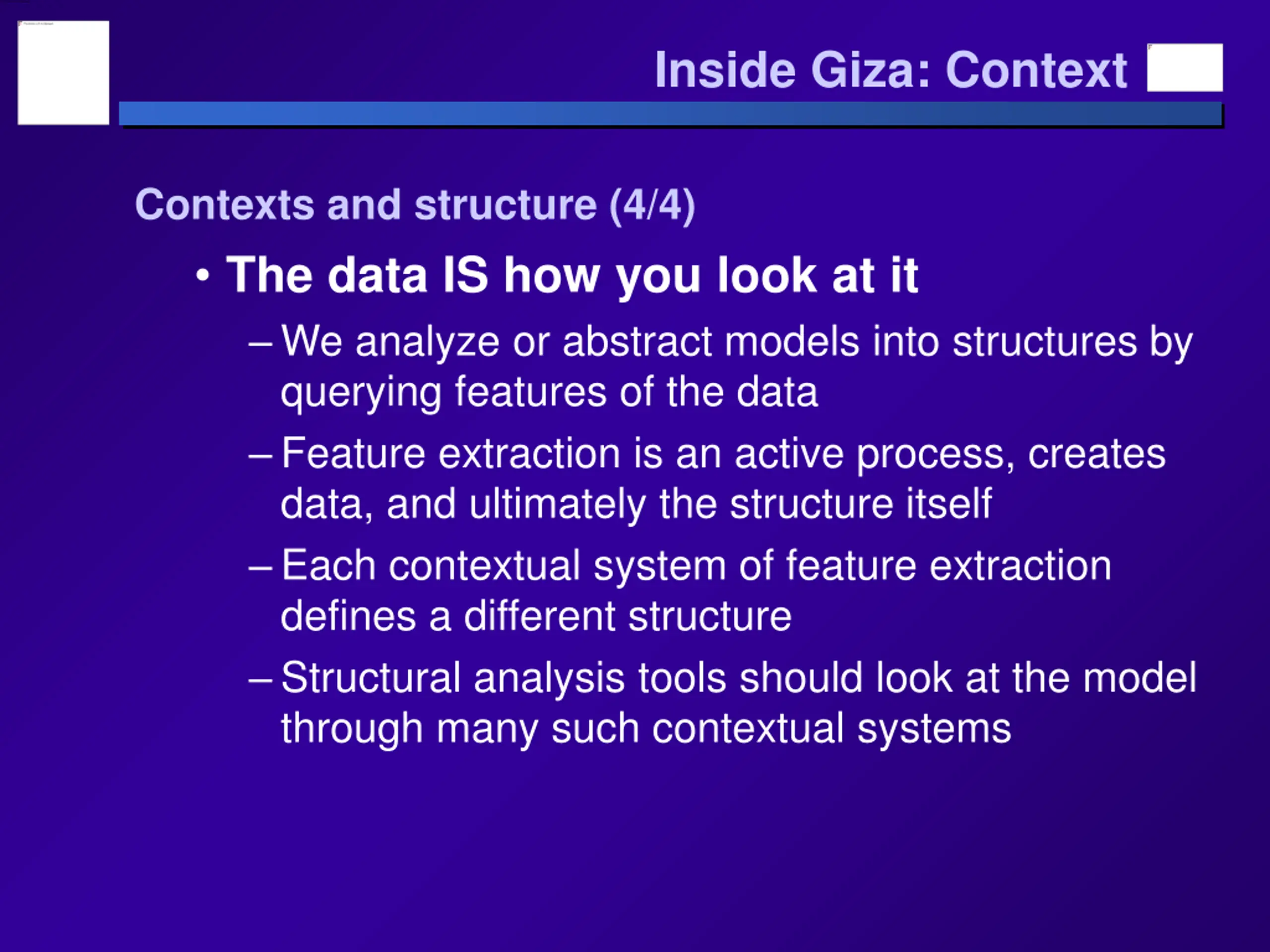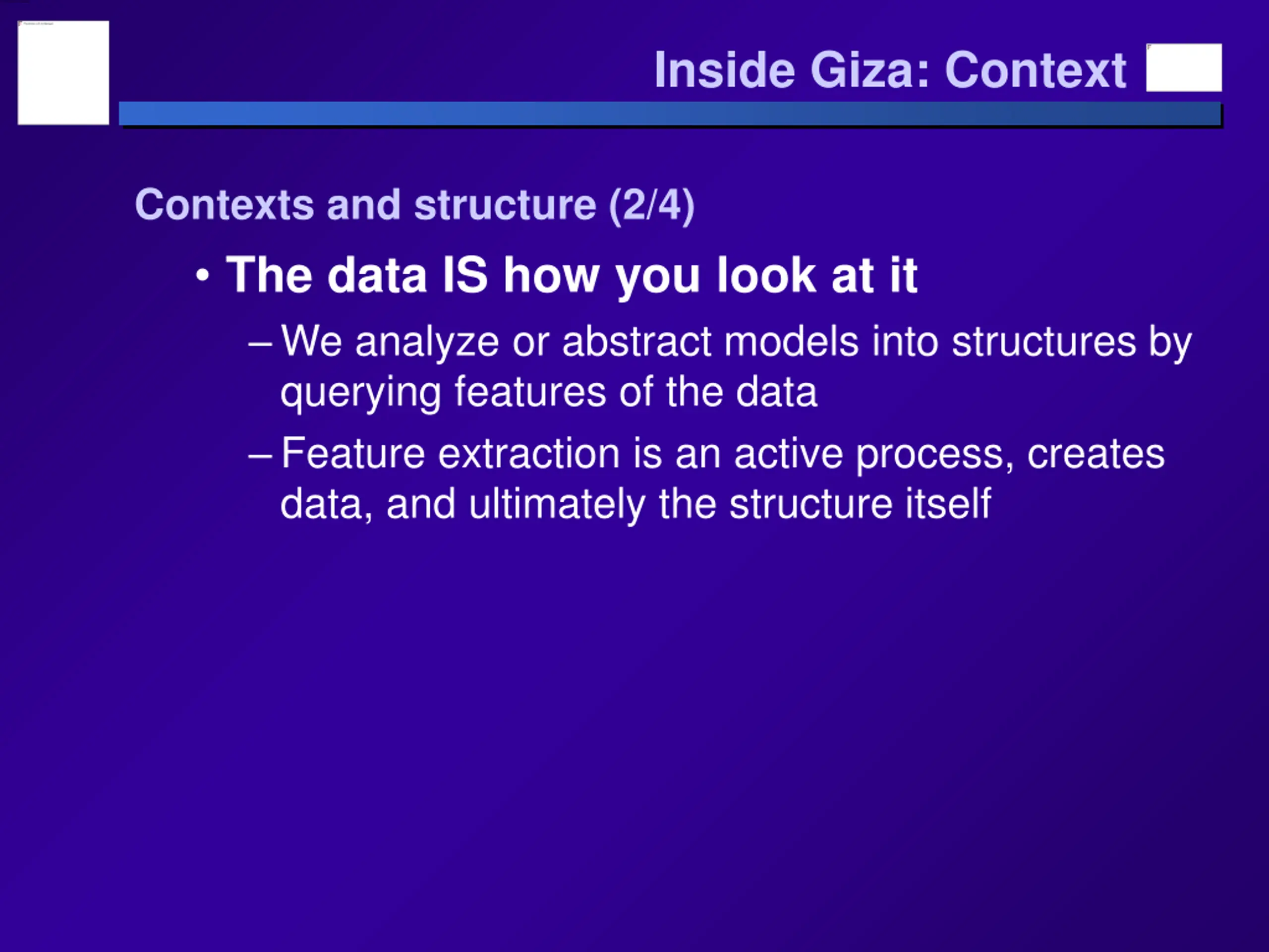 Inside Giza: Context Contexts and structure (2/4) The data IS how you look at it We analyze or abstract models into structures by querying features of the data Feature extraction is an active process, creates data, and ultimately the structure itself